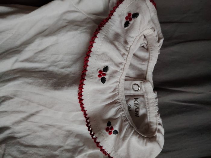 Bodies de chez Kiabi en taille 3 mois. Couleur blanc. Grand col avec détails rouges tout autour et broderie de fleurs. Élastiques au bout des manches.
