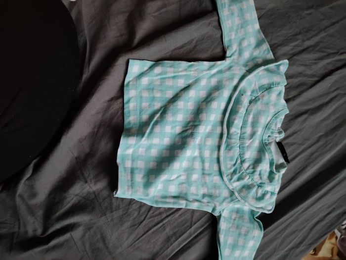 Blouse en taille 3 mois vichy bleu ciel avec détails froufours sur l'avant. Marque influx. En très bon état