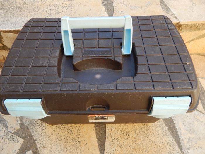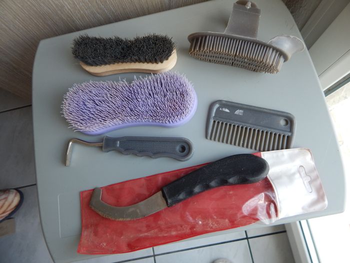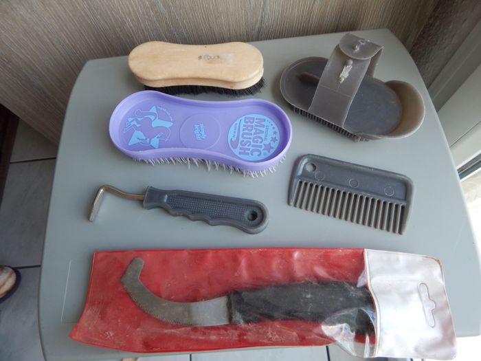 1 étrille, 1 peigne à crin, 1 brosse magique, 1 brosse douce, 1 cure pied, 1 couteau à oeufs de mouches 40 cm de long,25 cm de large, 24 cm de haut