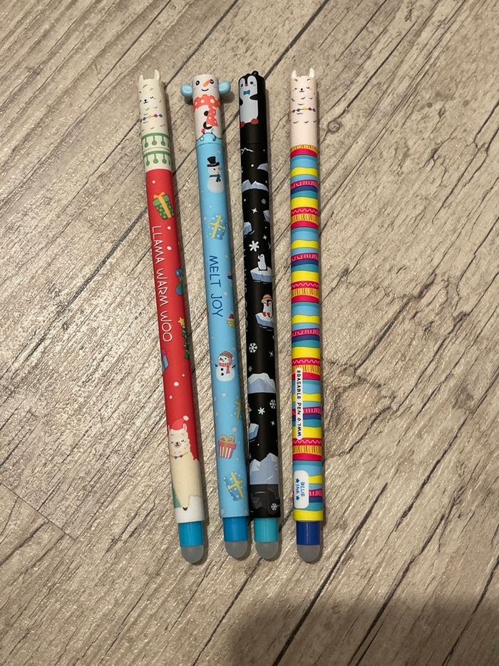 4 stylos de Noël hiver bonhomme de neige  pingouin et lama