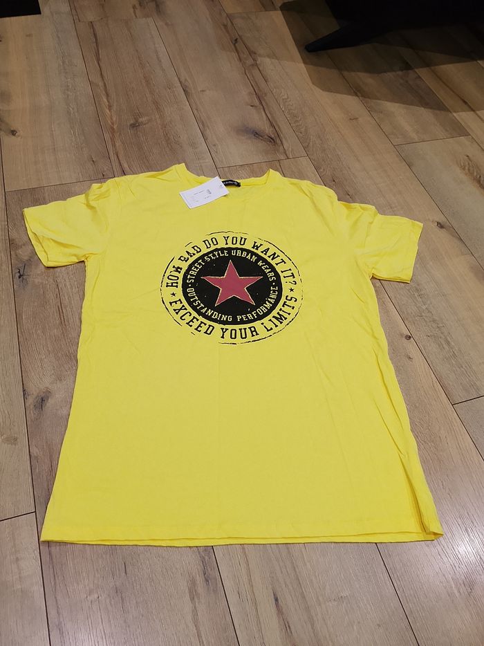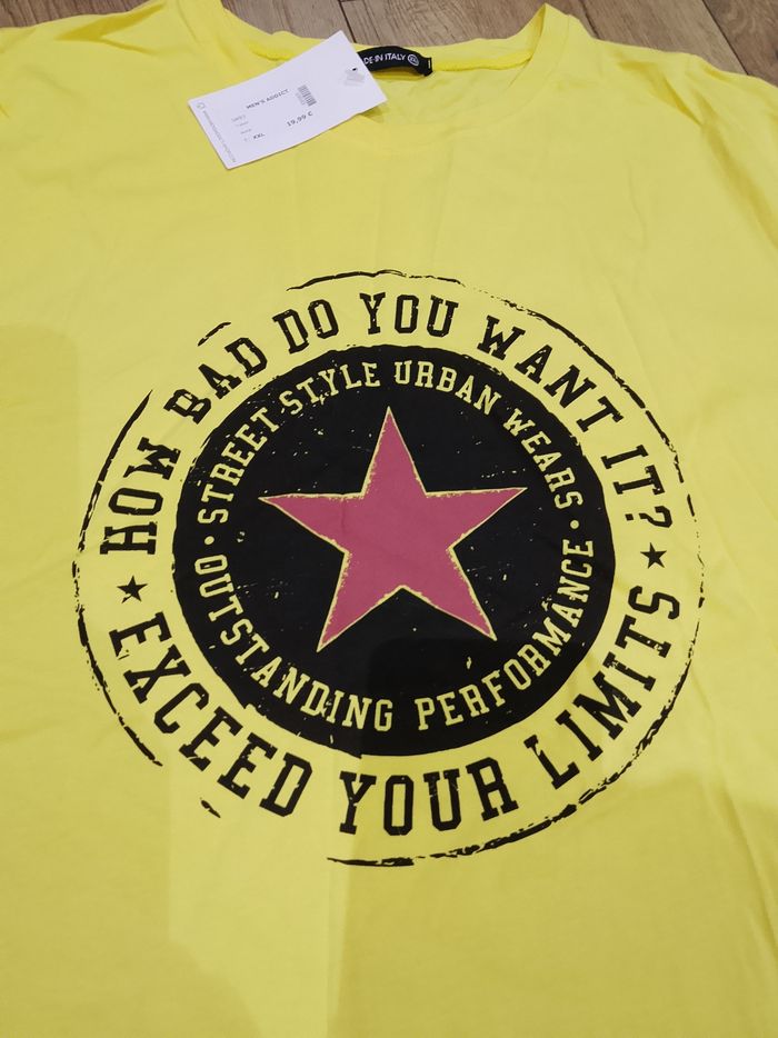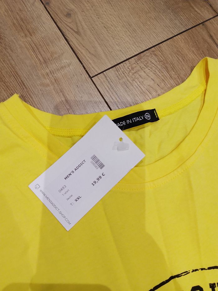 T-shirt jaune manches courtes pour homme, flocage sur le devant, uni sur l'arrière. Taille : XXL Marque : Mtx Mesure dessous de bras à dessous de bras : 55cm Article neuf avec étiquette. Vendu en magasin au prix de 19,99€. 0493 XXL N°1