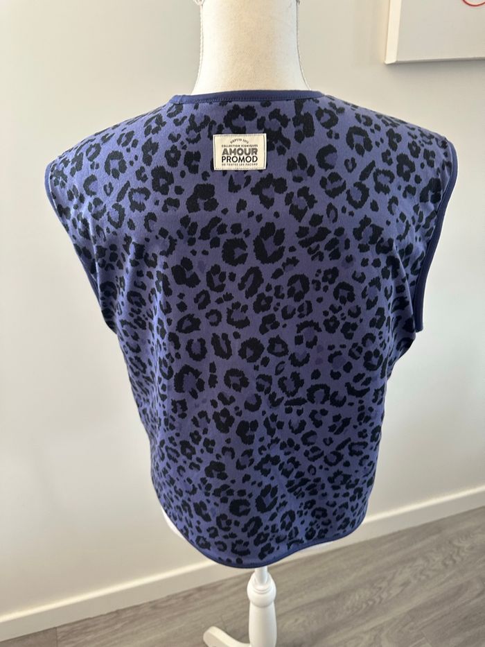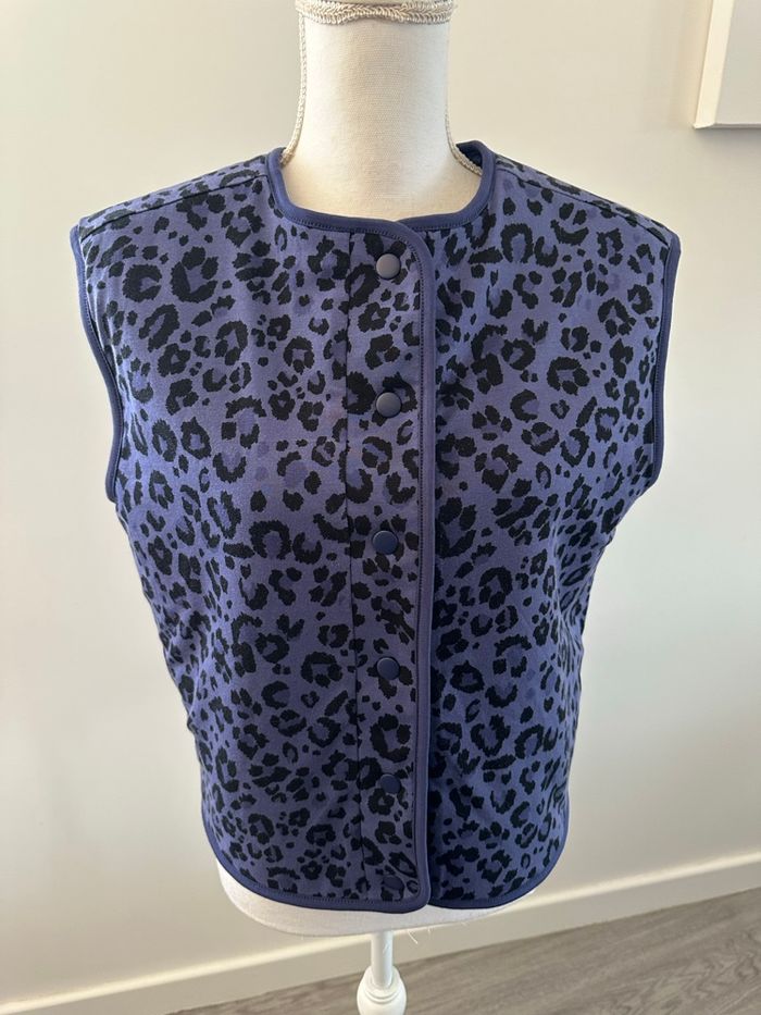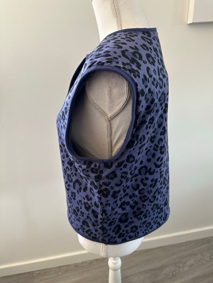 Veste sans manche - Excellent état - Taille 38 équivalent M Dimensions en bas de l’annonce - Modèle Paloma - Marque Promod - Bleu et noir - Un côté fausse peau de mouton Sherpa - Un côté léopard - Se ferme avec des pressions - Polyester recyclé, coton, élastane Dimensions: - 55cm niveau aisselles - 55cm de long