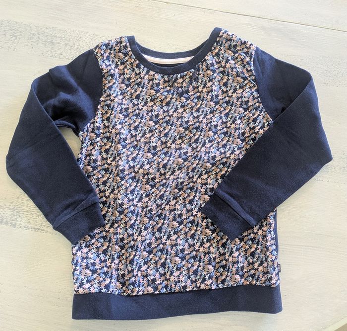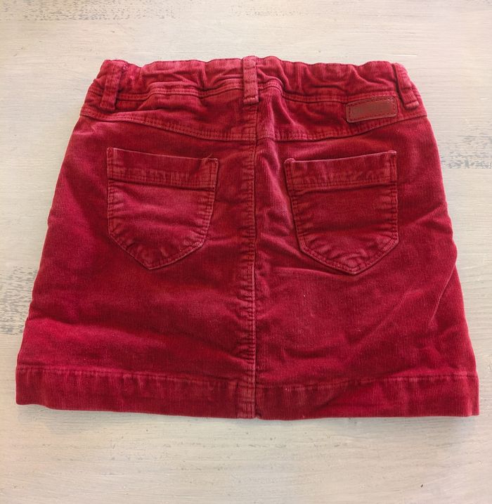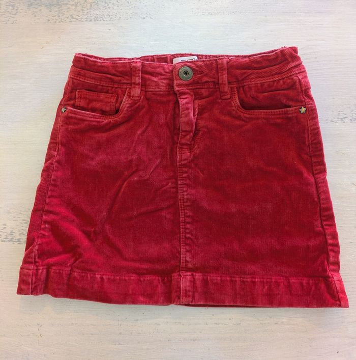 Lot de 5 pièces de la marque Okaïdi Vêtement fille 6 ans. Ce lot est composé - d'une jupe en velours côtelé fin, de couleur rouge bordeaux, Bouton pression à la taille, élastique de resserrage à la taille, poche avant et arrière. Composition coton et elasthane. En parfait état. - d'un T-shirt bleu marine avec sequin sur le devant, 100% coton, en très bon état, - d'un legging côtelé bleu marine, en coton et polyamide Et d'un sweat bleu marine avec un voile (apposé sur le sweat) imprimé de petite fleur, 95% coton et 5% elasthane. Le sweat présente un petit défaut, un fils tiré, peu visible, voir la dernière photo. #Malyssselection #Okaïdi #vetementfille6ans