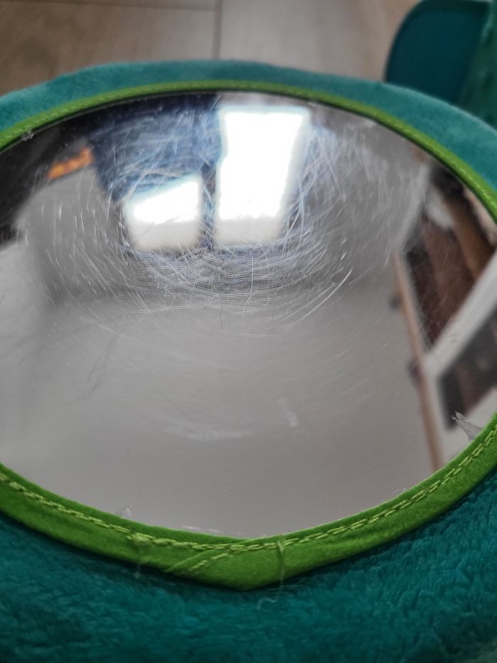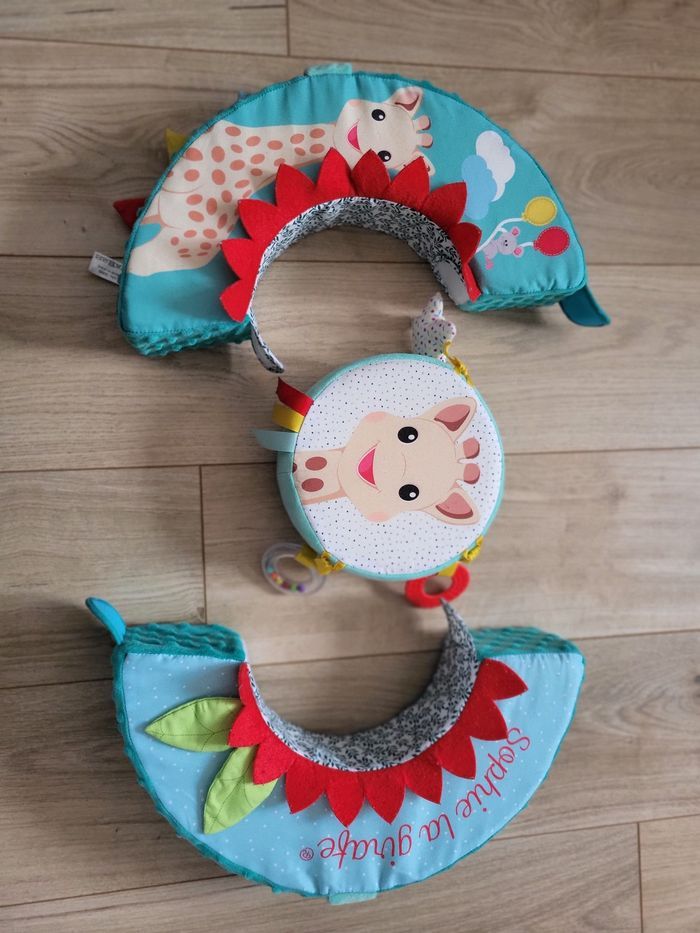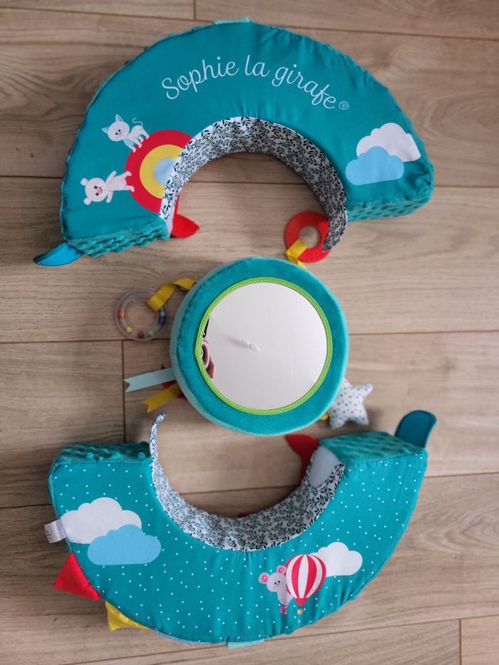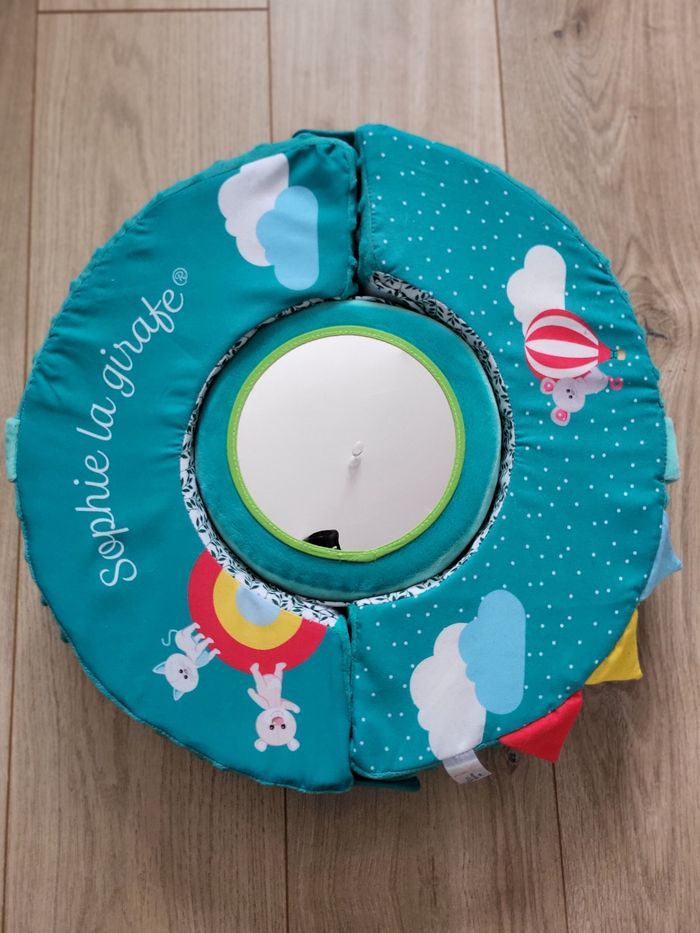 Type d'article : Roue de motricité et d'éveil pour bébé / nourrisson / nouveau né Age : A partir de 6 mois Licence : Sophie la Girafe État : Très bon, a été lavé pour la vente. Le miroir est rayé, notament lors du lavage (Cf photo) Prix neuf : + de 45€