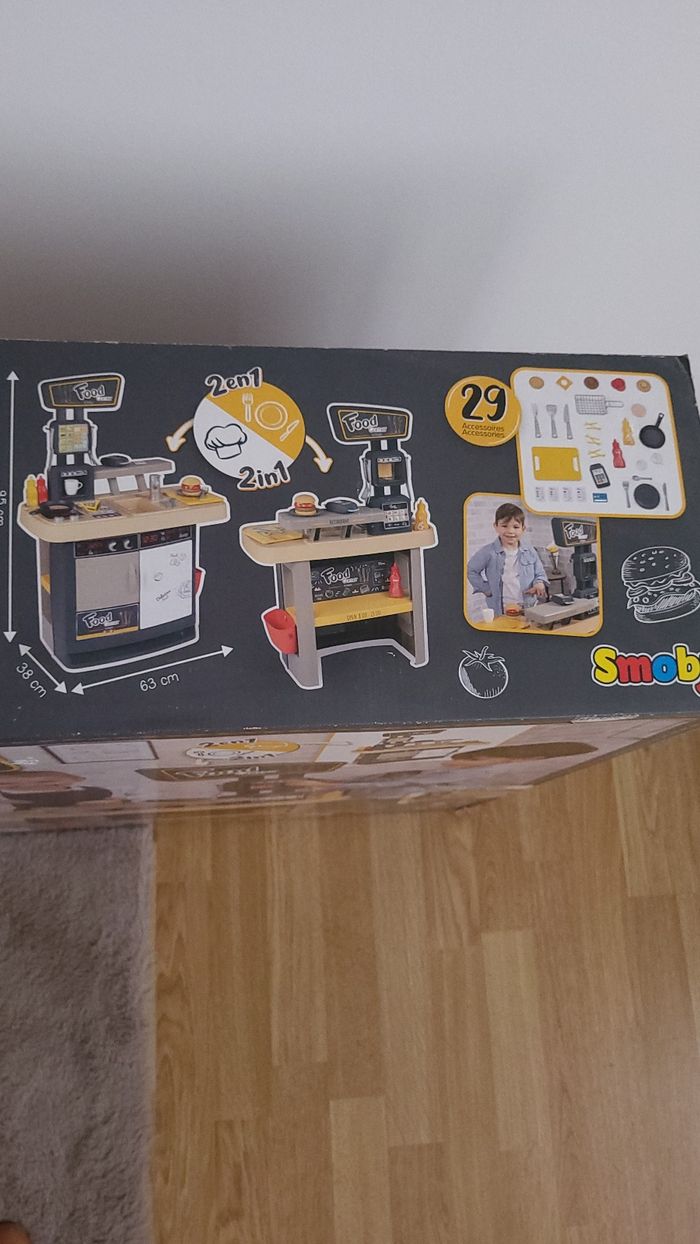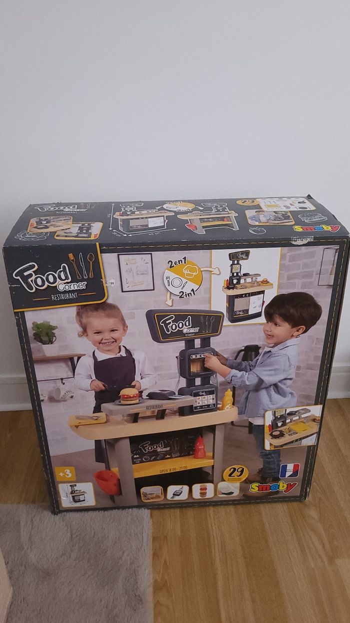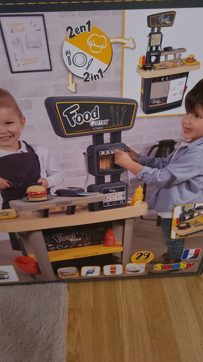 Food corner restaurant smoby neuf jamais déballé. Il y a 1 côté restaurant et 1 côté cuisine. 29 accessoires fournis. Dès 3 ans. Les coins de la boîte sont un peu usés mais elle est toujours fermée.