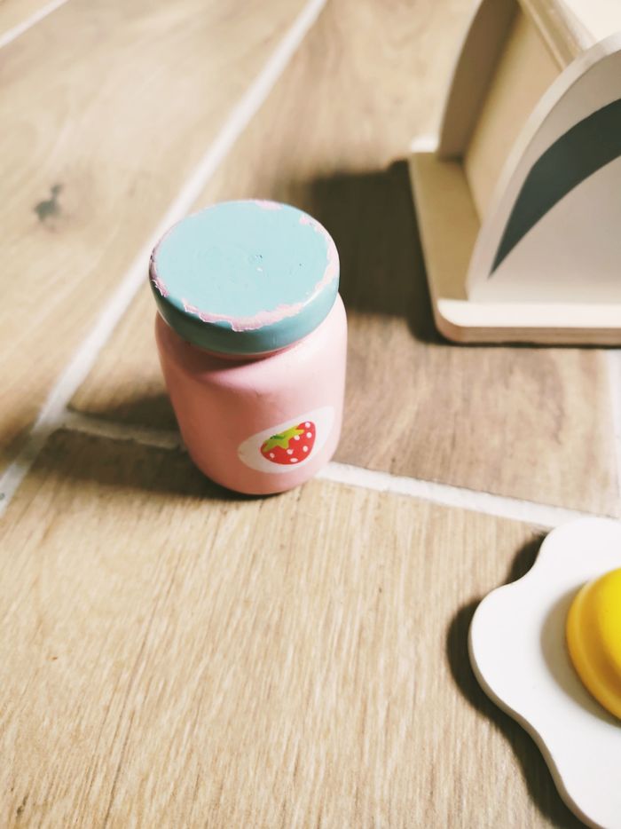 🎀Très bon état général. Quelques légères traces d'usure sur le couvercle de la confiture (voir photos), mais cela n'enlève rien au charme et à la solidité du jouet