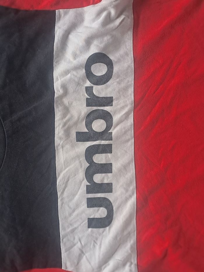 Tee-shirt homme Manches courtes Col rond Couleur Rouge Blanc Noir Inscription UMBRO sur l'avant, à l'arrière dans le bas le logo (un peu abîmé) Taille M (38) Marque Umbro