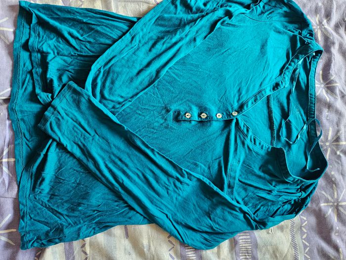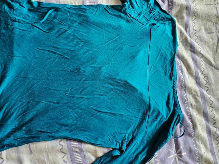 T-shirt vert canard, col V 4 boutons, fausse poche à gauche. Détail dos