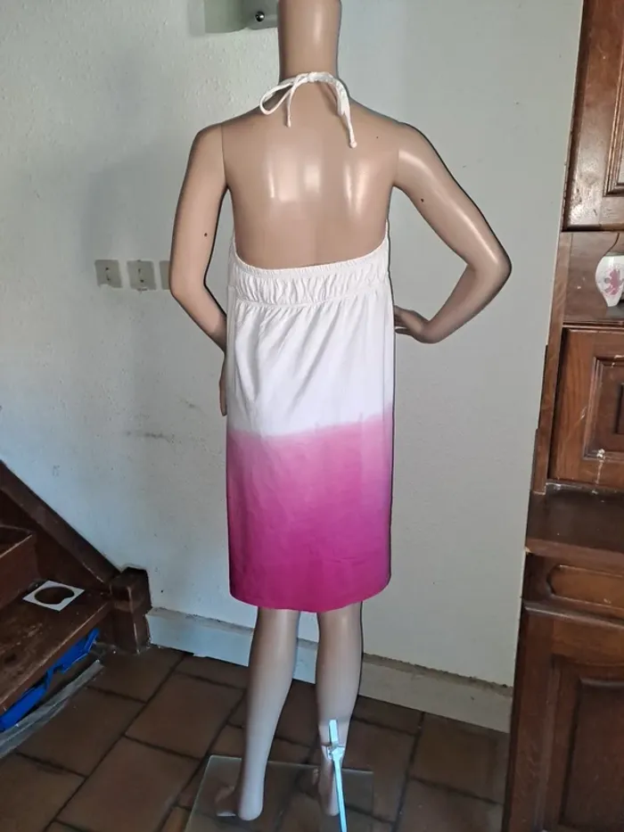 Je vends cette robe femme XL aux dégradés de couleurs rose et blanc. Une pièce légère et féminine, parfaite pour l'été ou les occasions décontractées. - Type de produit : Robe - Univers : Femme - Taille : 42 - XL - Couleur : Rose / Fuchsia dégradé blanc - Caractéristiques : Encolure halter, Dos nu, Élastique à la taille N'hésitez pas à me contacter pour plus d'informations ou de photos.