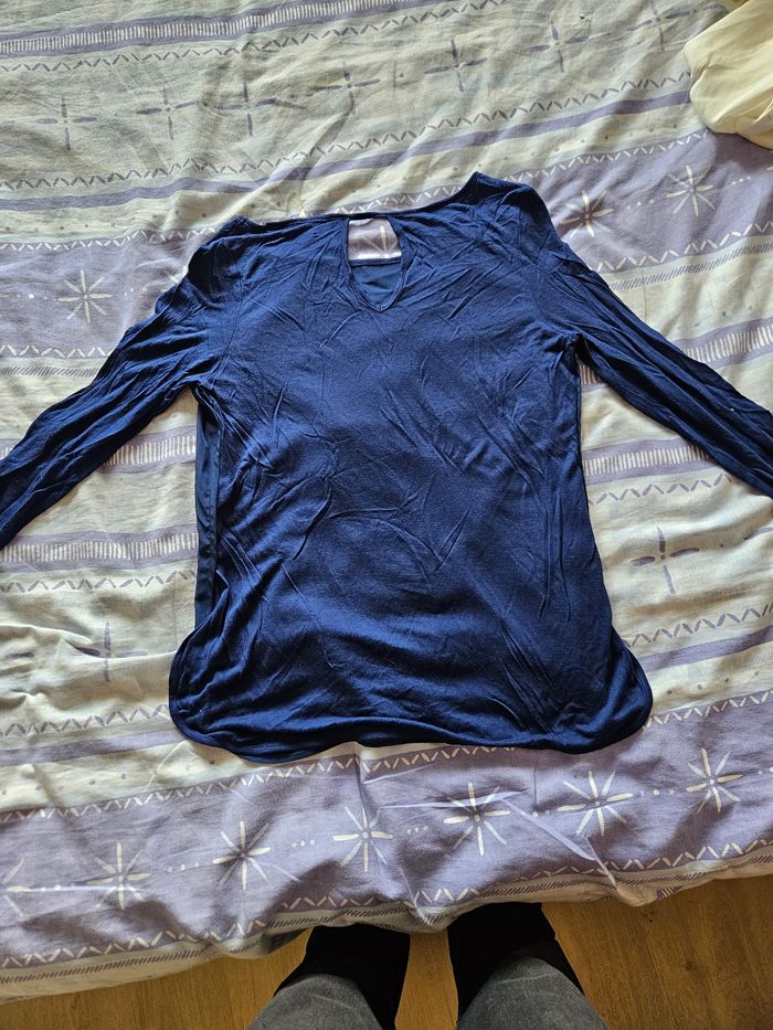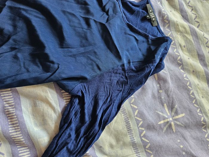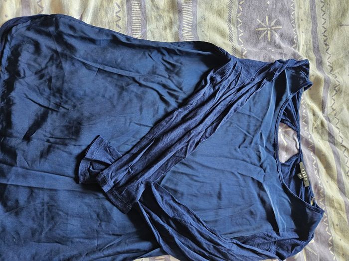 T-shirt bleu marine matiére satiné sur le devant, matiére coton manche et derriére. Goutte derriére au niveau de col, voir photo