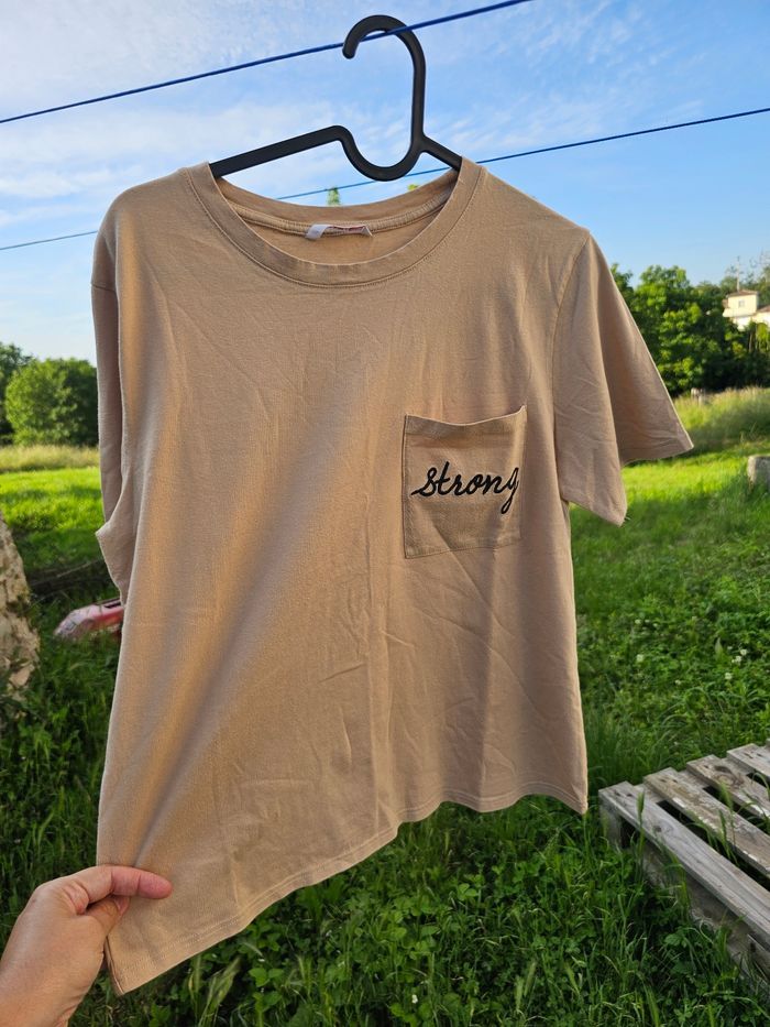 Vends ce jolie Tee-shirt femme manche courte avec l'écriture strong couleur beige café Pas de défaut ni tâches Les vêtements sont lavés donc propre, sur les photos prises après lavage donc vêtements peuvent être froissé, rien grave. Maison sans sans animaux et non fumeur Envoi soigné et rapide max 48h ( sauf le week-end colis déposé le lundi)