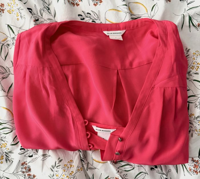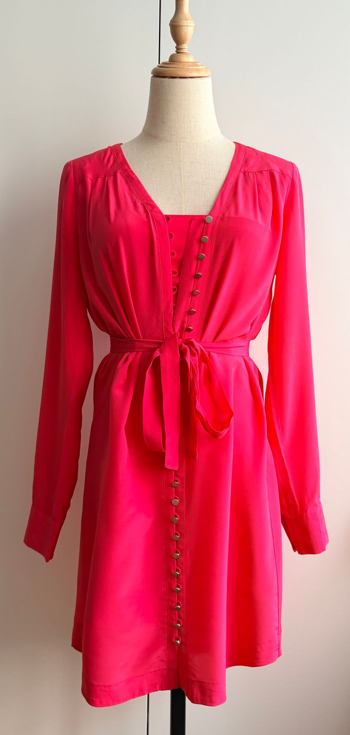 Robe de marque Club Monaco, manches longues, taille 0, doublée (doublure détachable), 100% polyester. Couleur rose, boutons sur toute la longueur, ceinture. Longueur: 85cm
