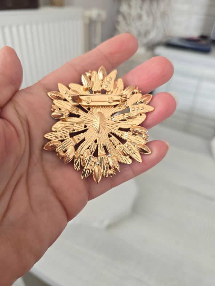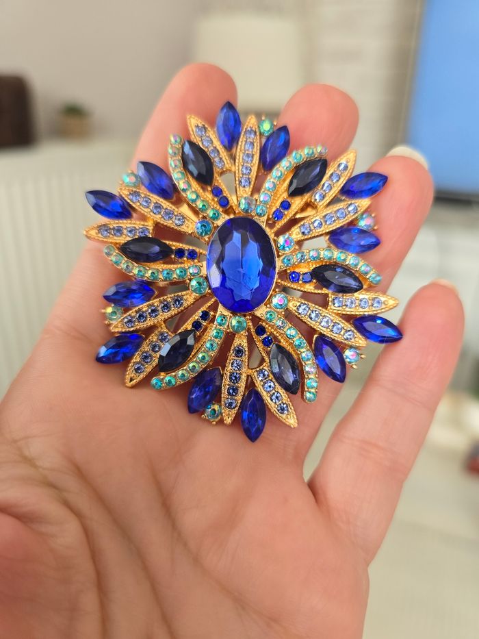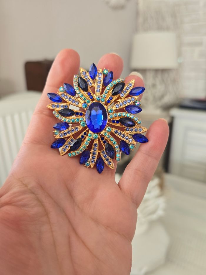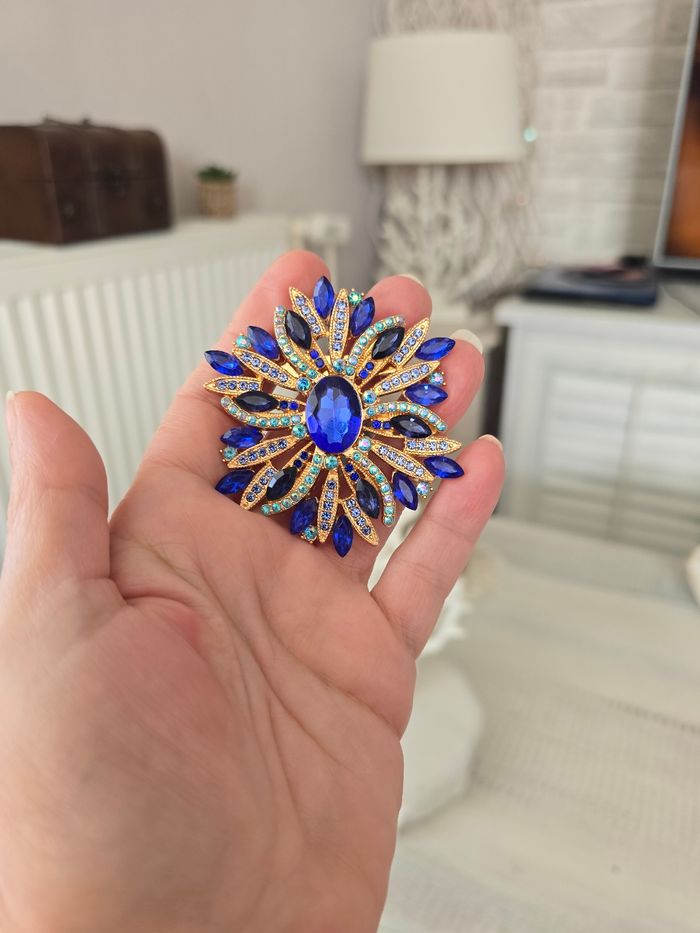 Broche dorée avec strass bleu Hauteur 6,5 cm Largueur 6 cm Neuve * Prix non négociable