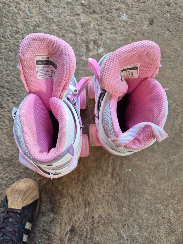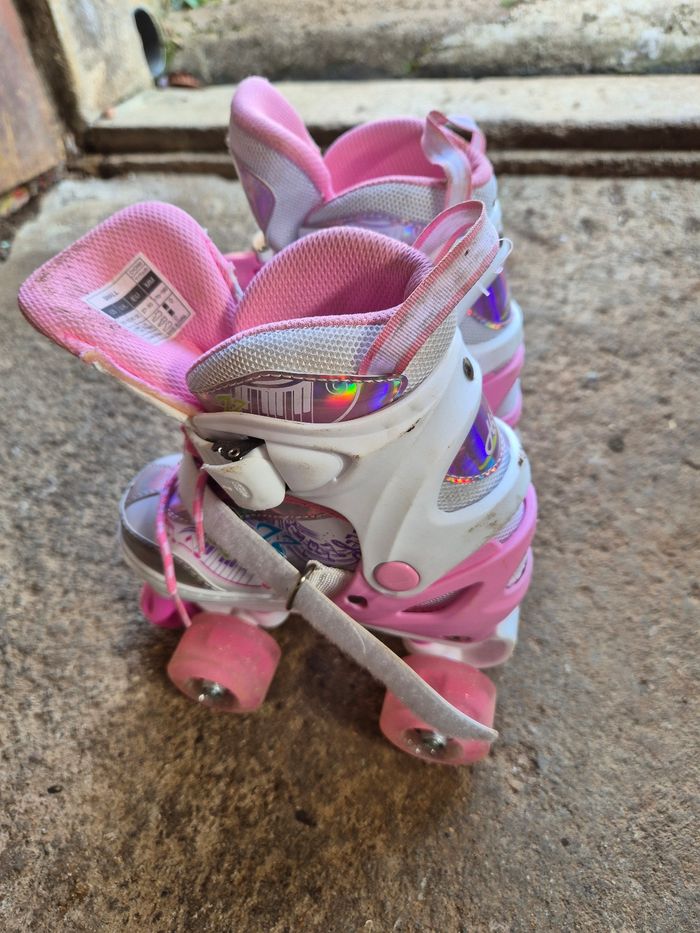 Patin a 4 roulettes ajustables. Les 8 roues sont lumineuses. Très bien bon débuter les patins. Seront renettoyer avant la vente. Seront mises dans leur boîte pour l'envoi Très bon état. Taille 27/30