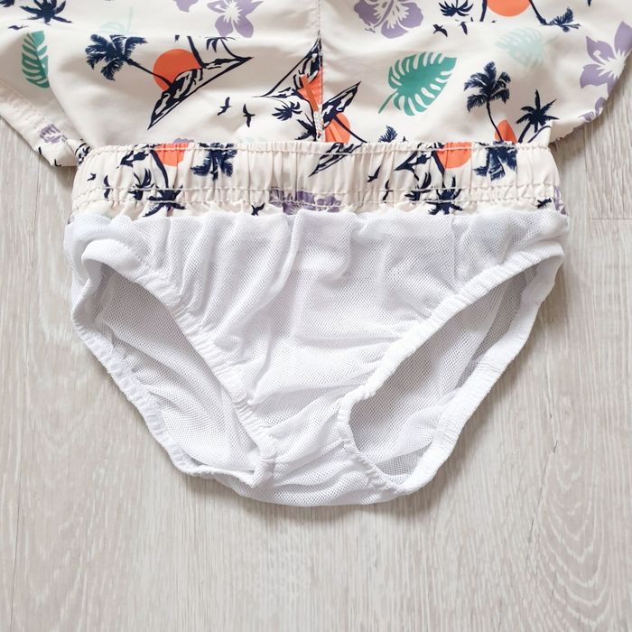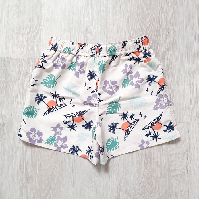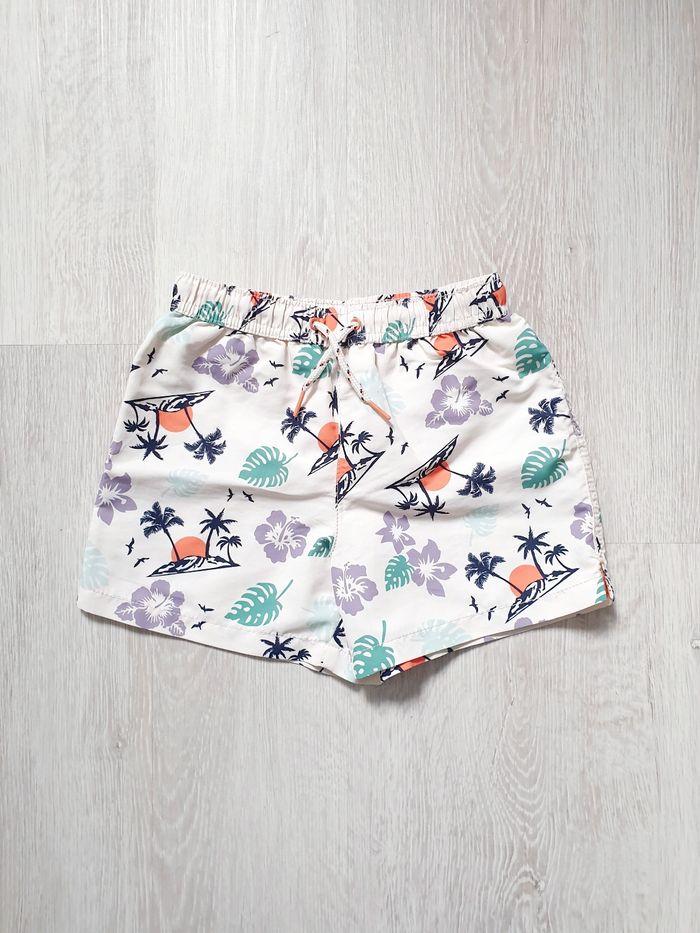 4 ans. Très bon état. Valeur neuf 16€. Short de bain écru • Imprimé tropical • Taille élastiquée et cordons de serrage • Filet au niveau de l'entrejambe.