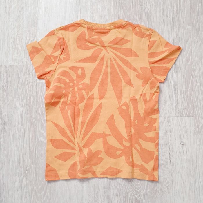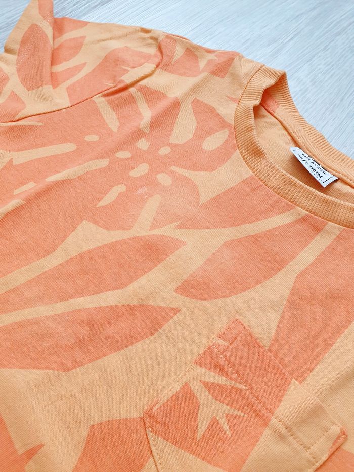 5 ans. Bon état. Valeur neuf 8€. T-shirt manches courtes et col rond • Coloris orange • Imprimé maxi feuilles • Coton biologique • Poche sur la poitrine.
