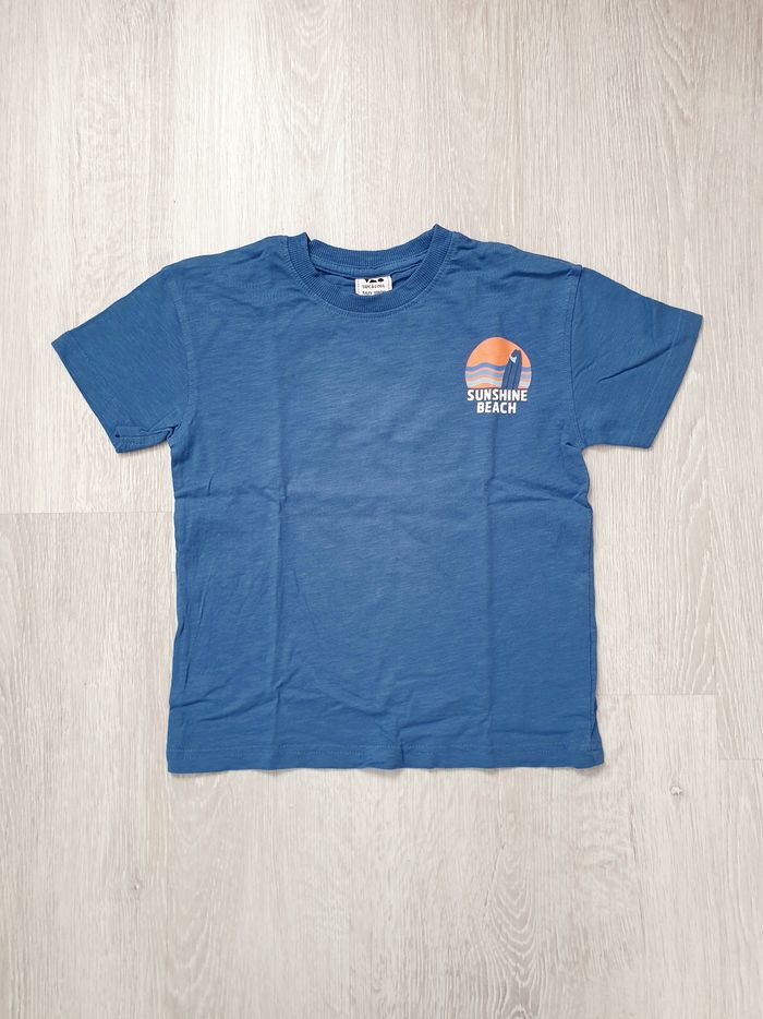5 ans. Parfait état. Valeur neuf 10€. T-shirt en coton biologique bleu • Manches courtes et col rond • Emmanchures descendues • Motif solaire orange et messages au niveau du coeur et dans le dos.