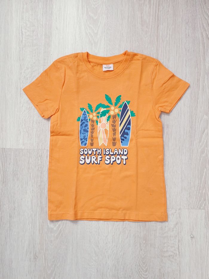 5 ans. Bon état. Valeur neuf 8€. T-shirt en coton biologique orange • Manches courtes et col rond • Messages et surfs colorés.