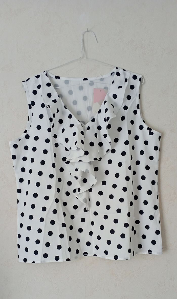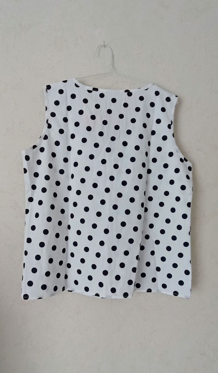 Haut pour femme blanc à pois noirs. Sans manches avec joli col en V et volant sur le devant. Mesures aisselles à aisselles 53 cm la longueur à plat 60 cm Coupe fluide et légère, agréable à porter. Idéal pour le printemps et l’été.