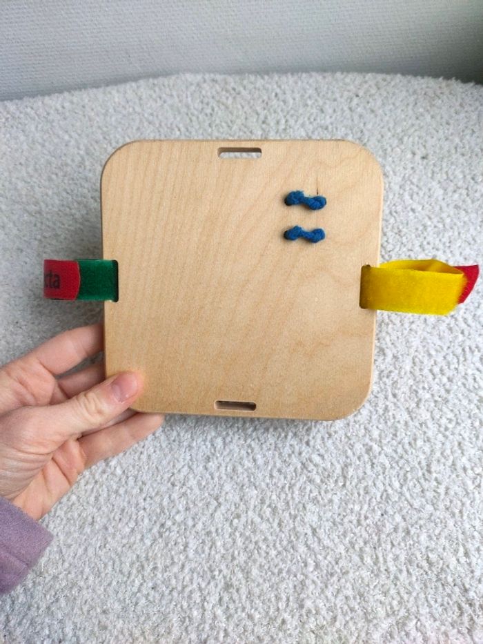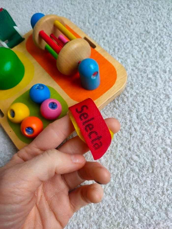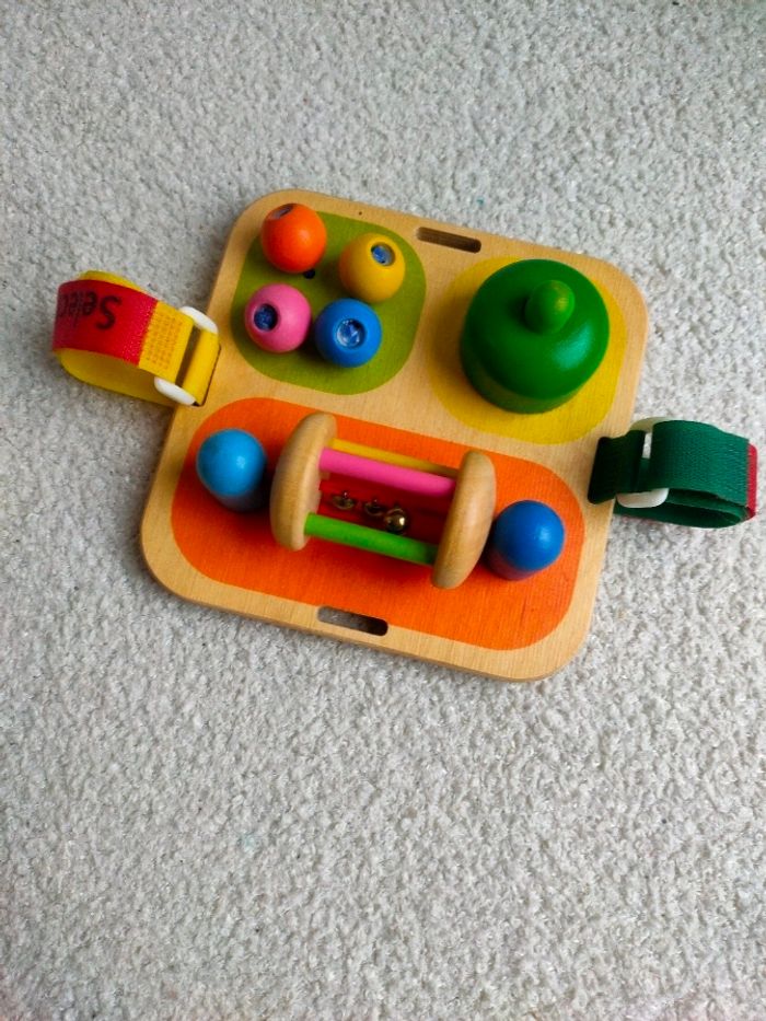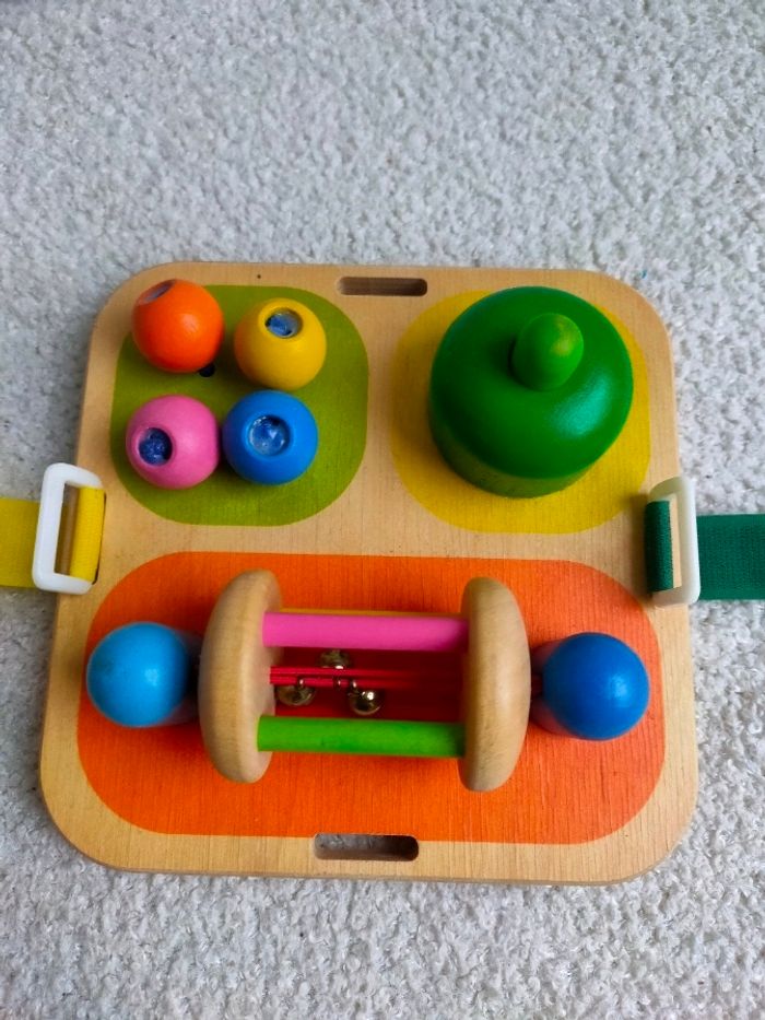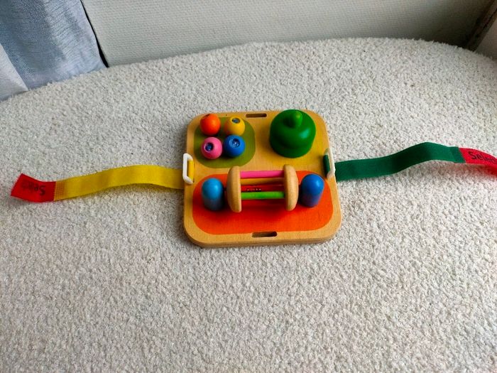 Tintement de clochette, cliquetis, coup de klaxon : le jeu d’activités peut faire tout ça. Facile à fixer, il permet à bébé de s’amuser en bougeant dans son petit lit ou dans son parc, et il stimule les premières capacités motrices de l’enfant. Il est en très bon état. Dimensions : 14 x 14 cm