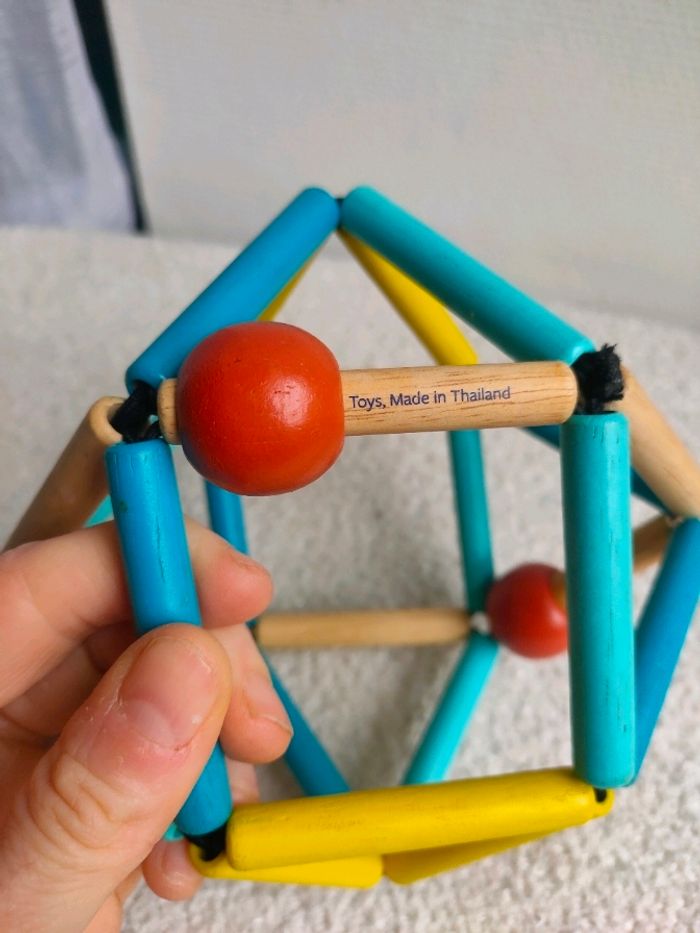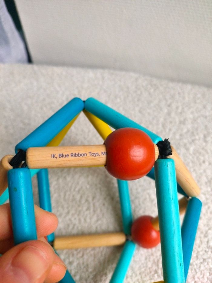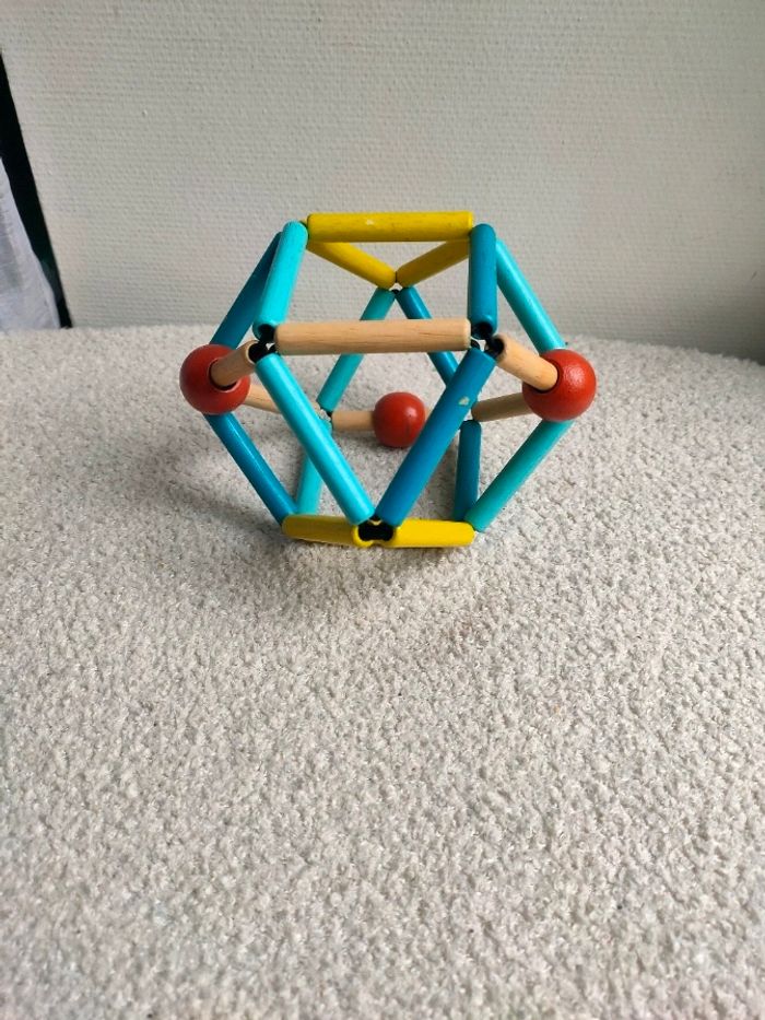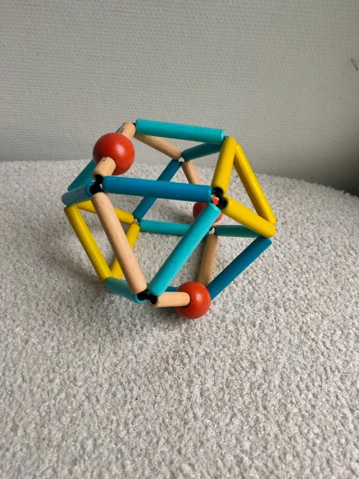 Ce hochet en bois a une forme originale. Il est ultra résistant, souple, flexible, facile à attraper et à tordre dans tous les sens aux couleurs tendances. Idéal pour éveiller les sens des bébés. Il a de légère trace d'utilisation, il est en très bon état.