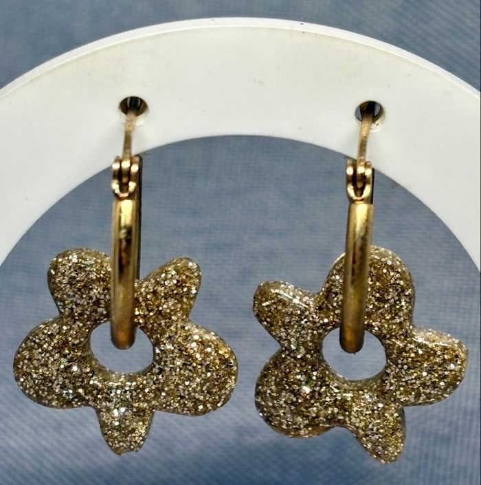 Une paire de créole en acier inoxydable (2cm) et une paire de Charm fleurs dorée pailleté en résine UV LED (pièces uniques, pouvant présenter de légères imperfections qui font tout leur charme). Ils sont interchangeables et accompagnés d’une paire de créoles en acier inoxydable. 🔹 Résine UV LED 🔹 Créoles en acier inoxydable incluses 🔹 Prix du lot : 3€ 🔹 possibilité de changer de couleurs sur demande avant de finaliser la vente 🔹 Charm supplémentaire sur demande avant de finaliser la vente à 1€ la paire 💰 Prix : 3€ le lot et 1€ la paire de Charm supplémentaire ✉️📦 envoi rapide et soigné Idéal pour changer de style facilement à petit prix 🌸