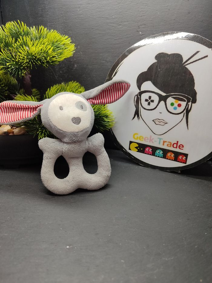 doudou hochet chien lapin obaibi okaidi gris blanc rouge rayé grelot Coeur 3689 - photo numéro 1