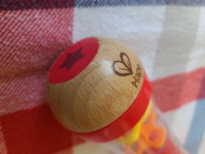 Jouet d'éveil musical rouge en bois. Marque Hape. Jolies couleurs. Bon état général avec quelques marques d'usure sur le bois et deux traces sur la partie transparente (voir photos). Parfaitement fonctionnel.