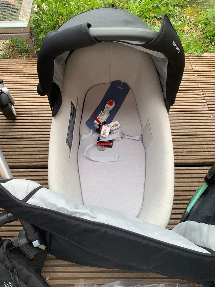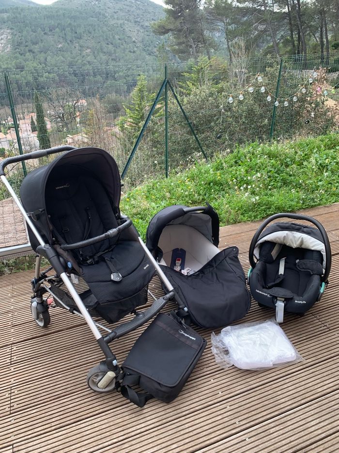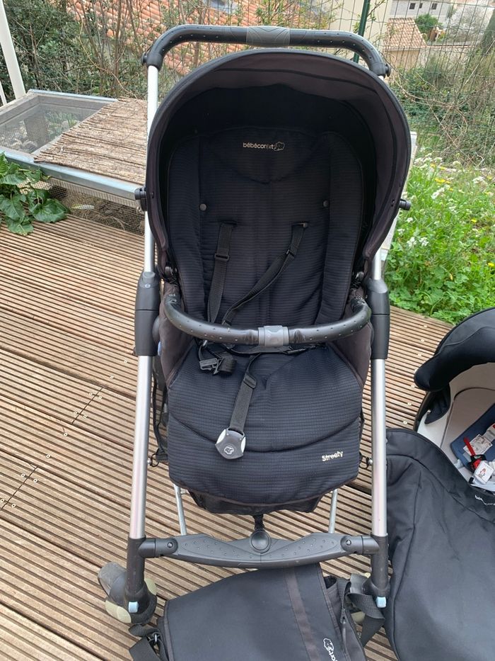 Poussette trio de bébé confort streety en bon état avec le sac à langer et l habit de pluie jamais servie