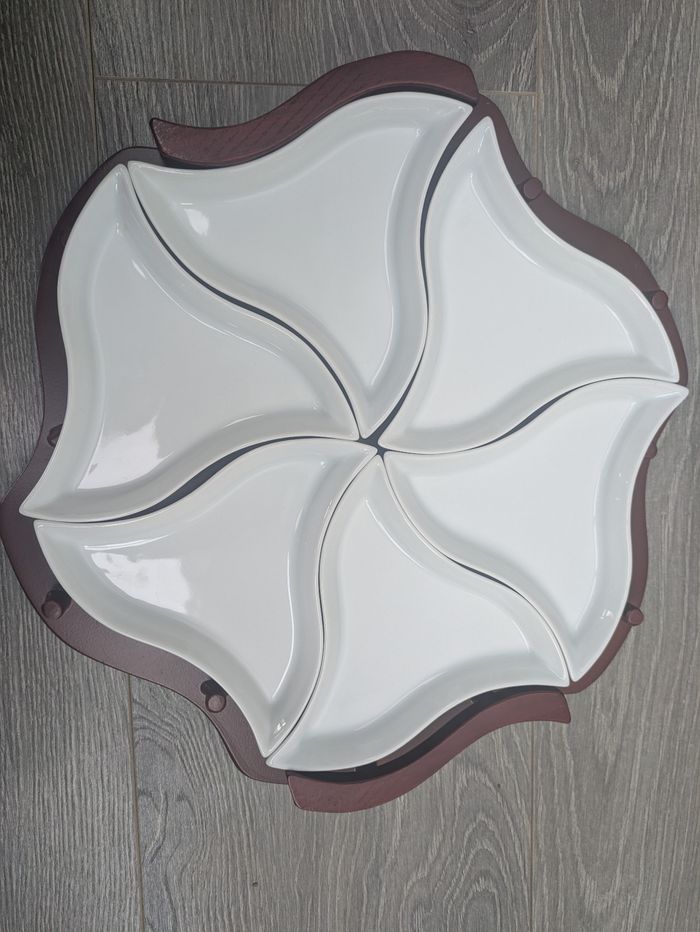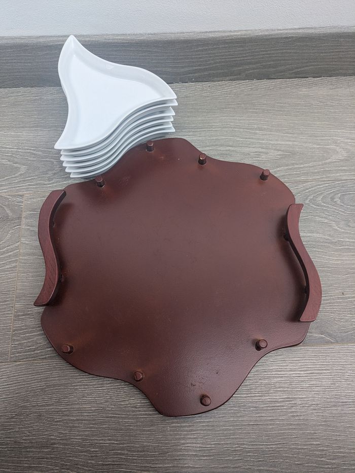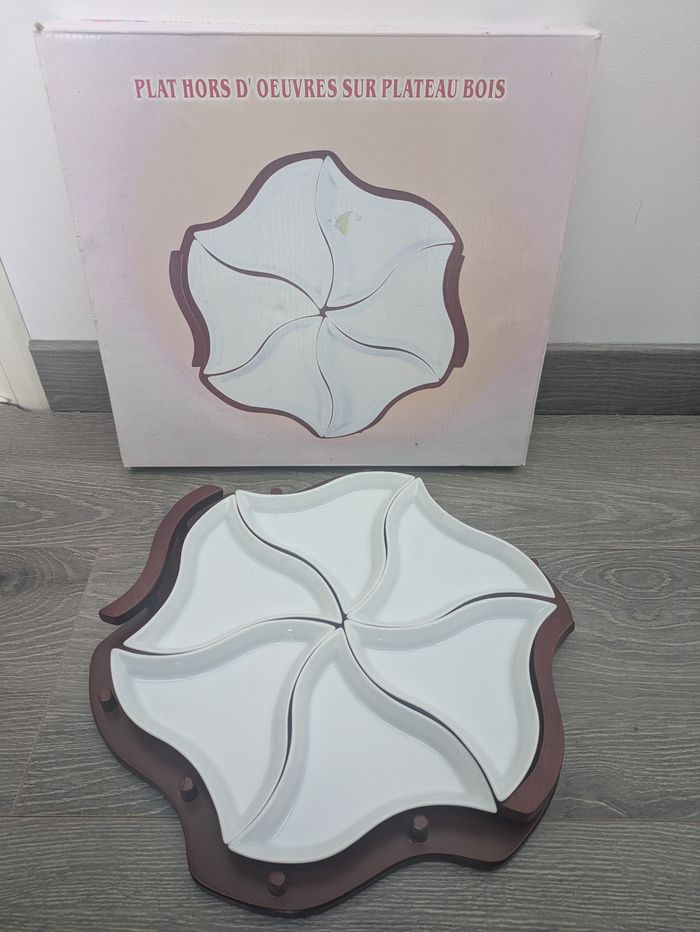 Bonjour, Je vends ce plateau en bois avec ses coupelles pour l apéritif.