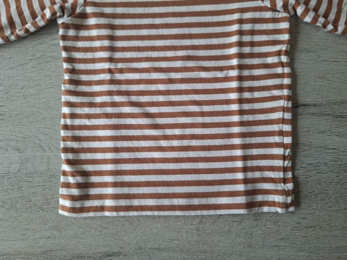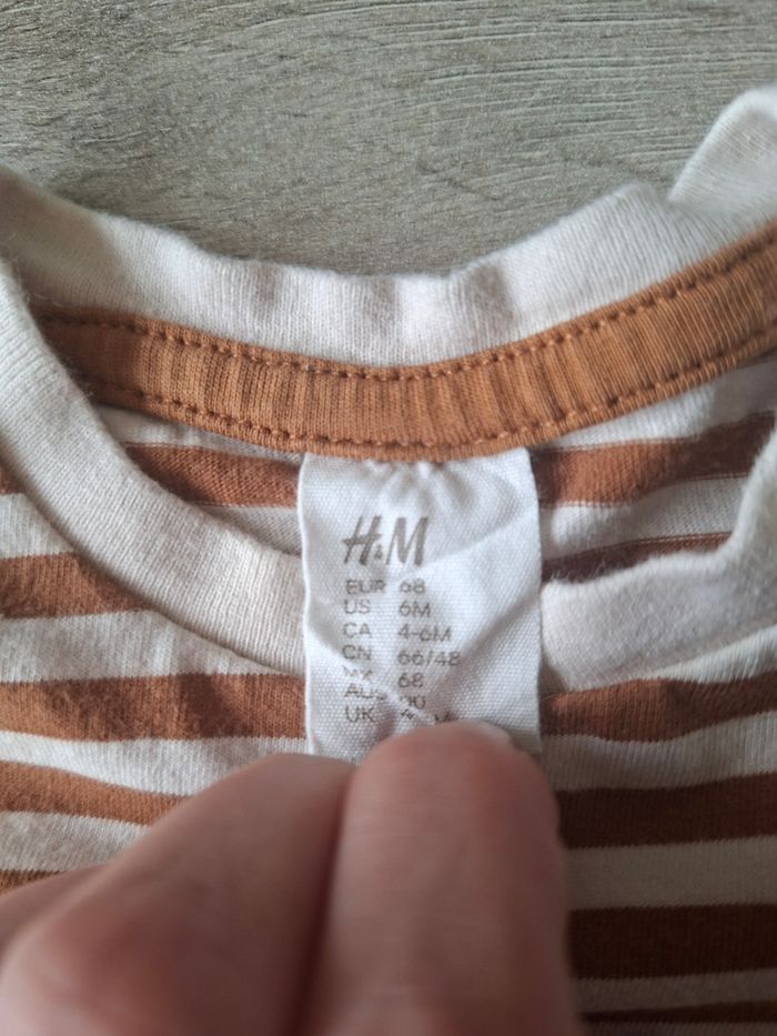 ❤️ Bonjour où Bonsoir ❤️ 💬 N°22 🌷 Tee-shirt Longues Manches 🌷 ➡️ Avec une pression sur épaule gauche 🏷 H&M 👶 6 Mois - 68 Cm 🎨 Blanc et Marron à Rayures 🧶 Étiquettes coupé 👍 En très bon état ✅️ Sans tâche ni trou 🛒 Veuillez consulter mes autres articles, je fais un grand tri. 📦 Envoie rapide