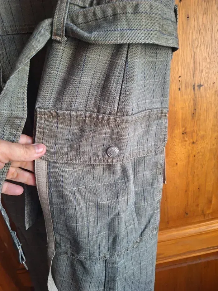Taille L mais taille petit, elle sera parfaite pour un 38 Tres chic Ceinture amovible 2 grandes poches latérales façon cargo A la fois chic et décontractée Malheureusement trop juste pour moi8 Fendue derrière de chaque côté, voir photos Comme neuve Conviendra à un 38 TL mais taille petit Mesures Aiselles à aisselles 48 cm environ Longueur 105 cm environ Consulter mes autres annonces pour composer des lots et faire des économies