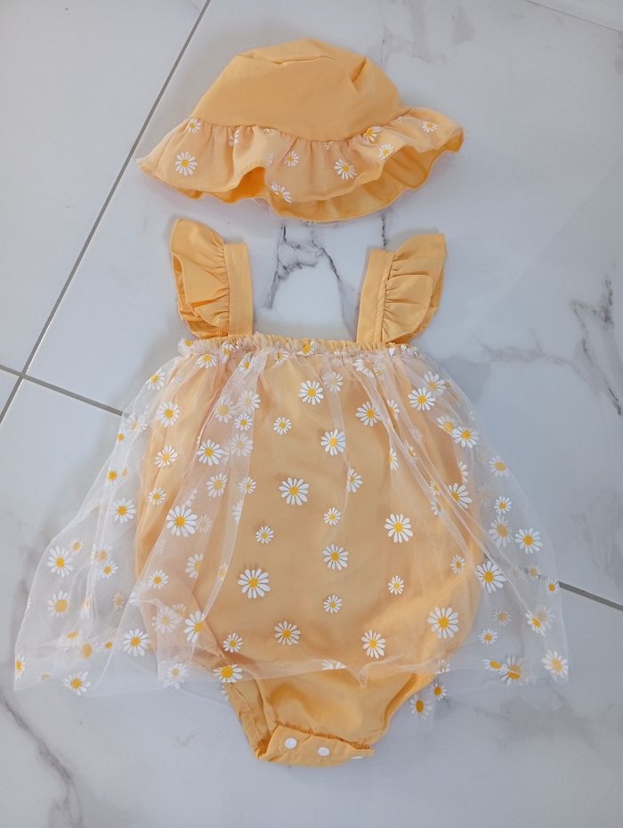 Joli ensemble barboteuse voile à paquerette et son chapeau. 9-12 mois. Porté deux fois. Neuf. Je vends également trois autres ensemble été 9-12 mois dans mon dressing.