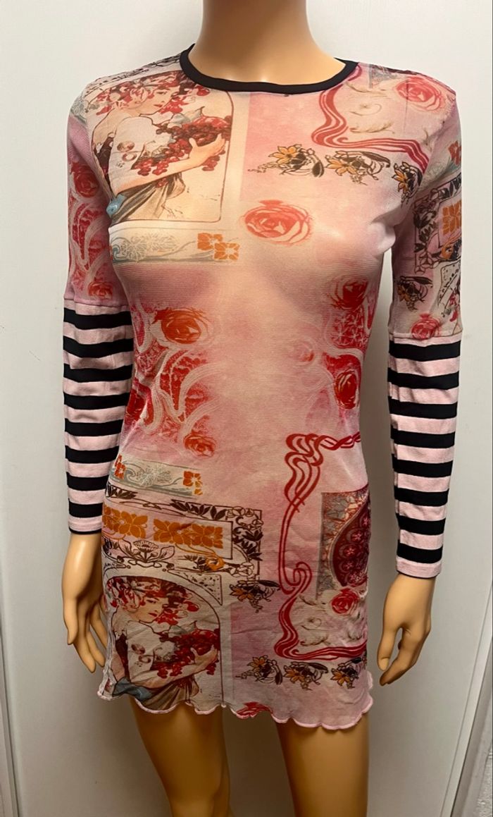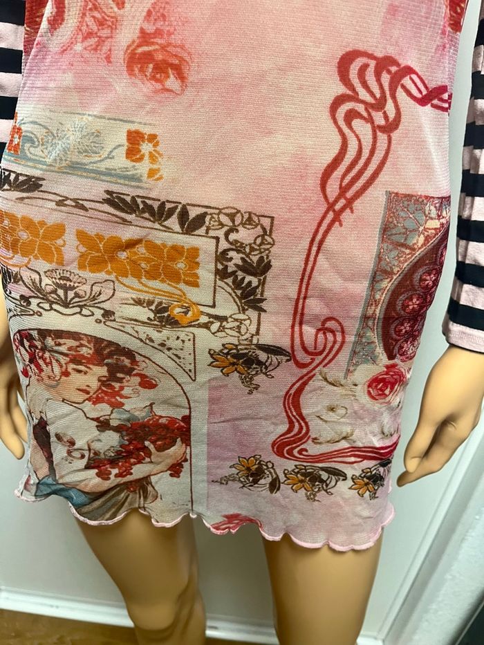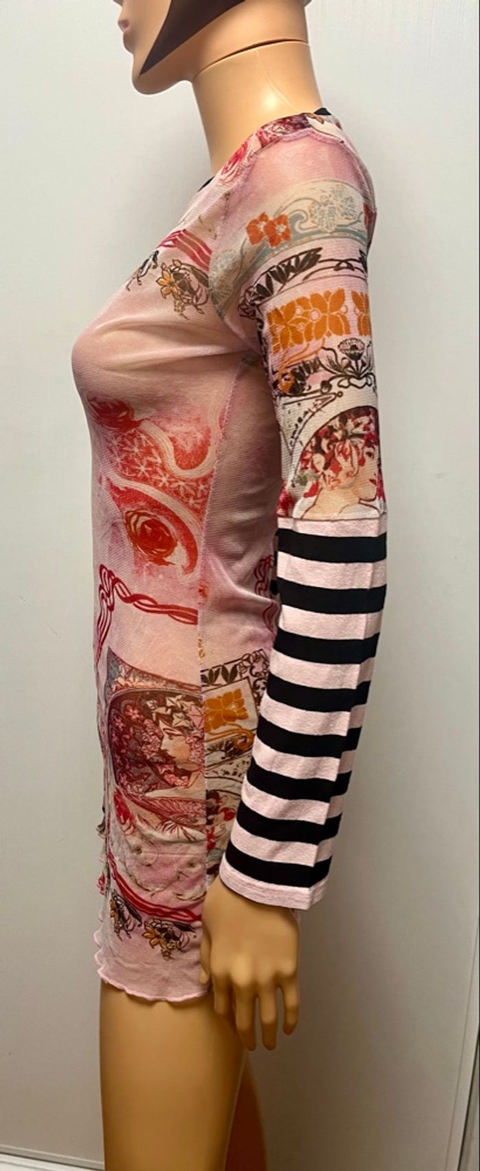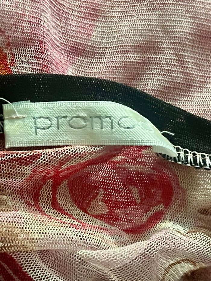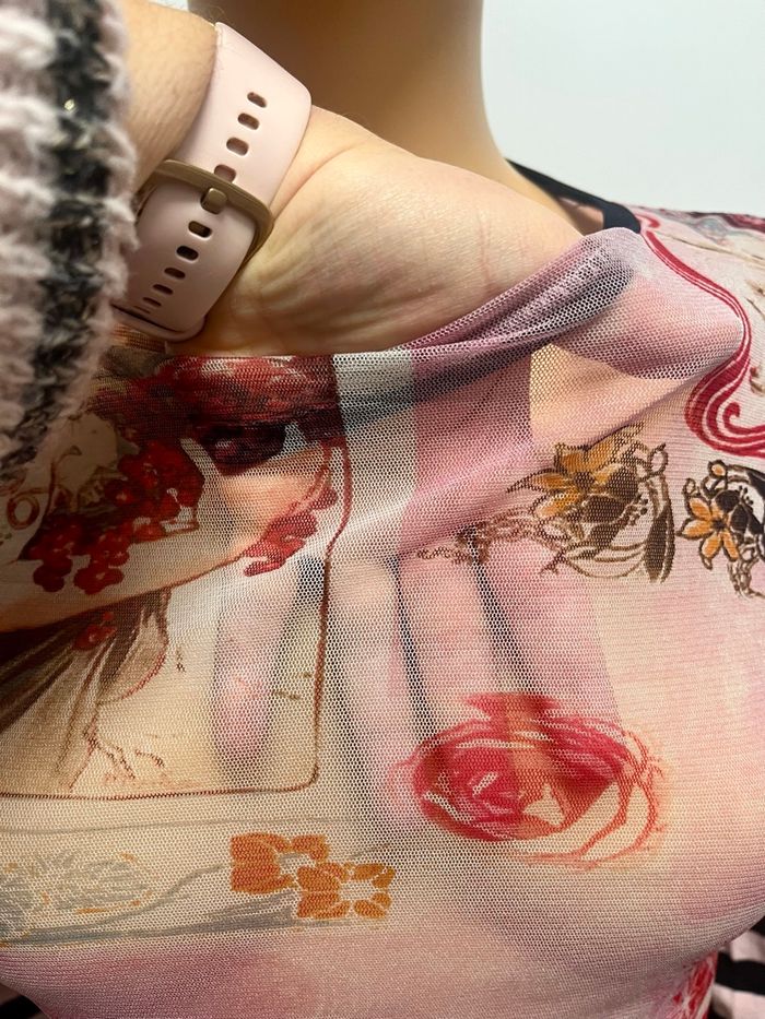 Tunique en voile transparente et avant bras plein idéal a porte avec un top bretelle noir en dessous ou brassière taille 38 mais l’étiquette a été coupée car avec la transparence ce n’était pas top, la matière est un peu extensible TBE