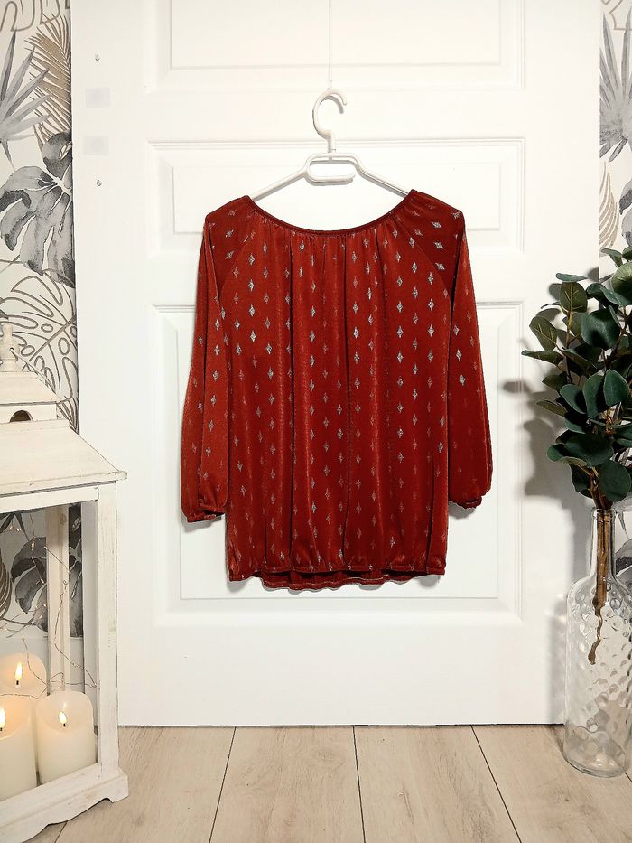Blouse Carnaby – Taille 40 – Couleur rouge – Motifs dorés – Élégante & fluide