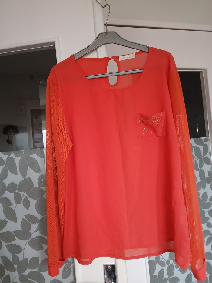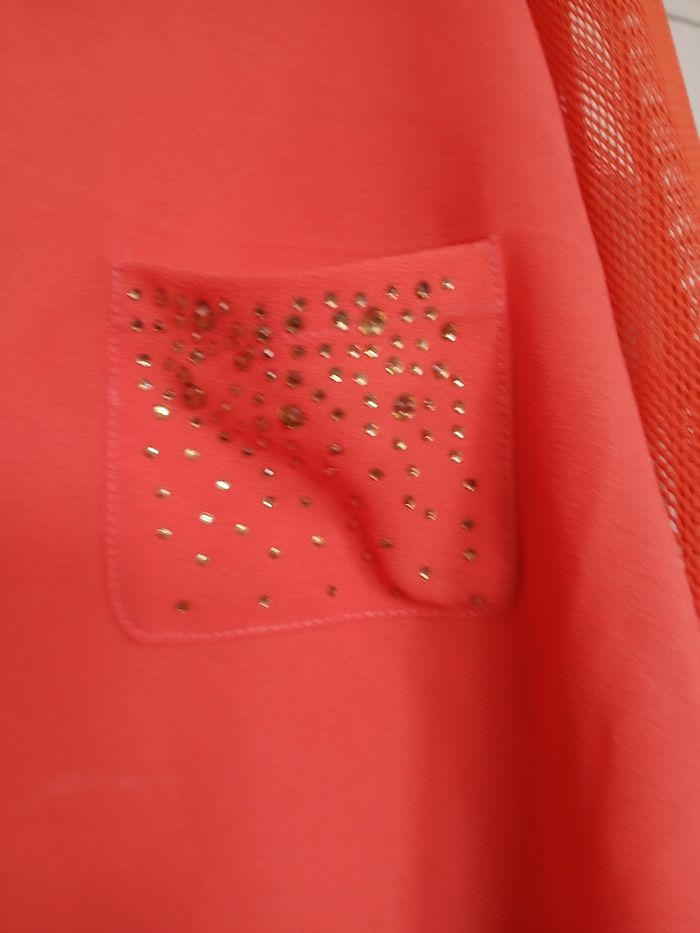 Haut orange lumineux et chic avec sa piche et ses brillants Manches ajourées