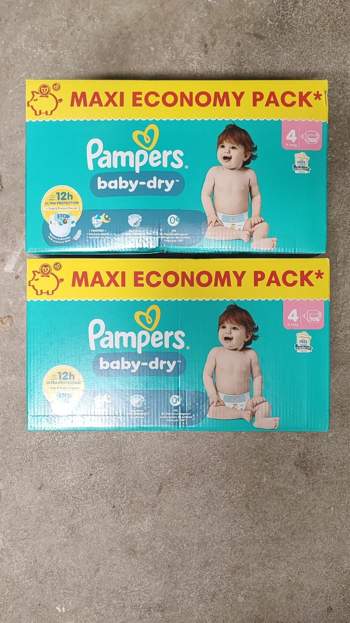 Vend lot de 2 cartons de couches Pampers baby dry taille 4 . 108 couches par carton soit 216 couches au total. Envoie rapide. Plusieurs cartons disponibles et différents taille disponible.
