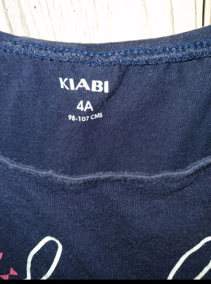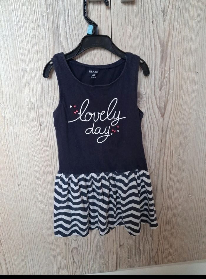 Jolie petite robe légère sans manches de la marque Kiabi, parfaite pour les beaux jours. ​Haut : Bleu marine avec inscription "Lovely day" et petits détails cœurs. ​Bas : Jupe fluide à motifs chevrons (zig-zags) blancs et bleu marine. ​Taille : 4 ans (98-107 cm). ​État : Très bon état, bien entretenue.