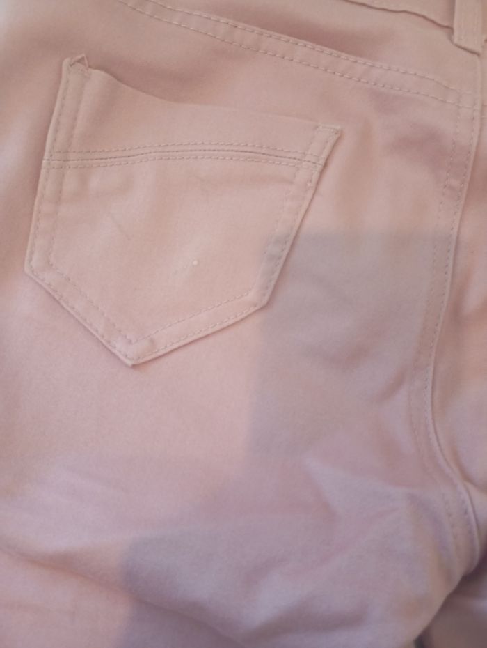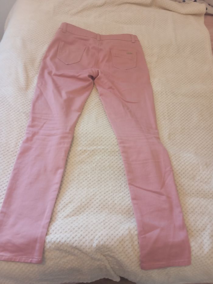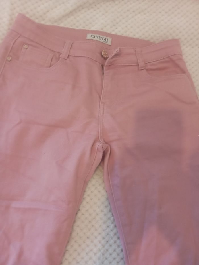 Pantalon femme rose. Mini tâche sur l'une des poches arrière. Petit Accroc sur une des jambes. En bon état.
