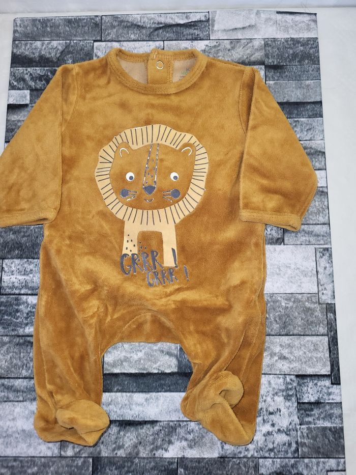 Description : Offrez des nuits paisibles et colorées à bébé avec ce lot de deux pyjamas en velours sélectionnés par Jardin Secret. Un mélange de peps avec le jaune moutarde et de douceur avec le blanc classique. ​Le Pyjama "Petit Lion" : Un magnifique velours jaune moutarde avec une tête de lion stylisée sur le devant. On adore sa crinière en relief et son look très tendance. ​Le Pyjama "Petite Étoile" : Un modèle blanc et bleu marine avec l'inscription brodée "Petite étoile" entourée de motifs célestes. Un grand classique indémodable. ​Praticité : Ouverture par pressions à l'arrière (pont) et à l'entrejambe pour un change facile sans trop découvrir bébé. ​Confort : Velours de qualité, souple et chaud, parfait pour la peau sensible des nouveaux-nés. ​Détails techniques : ​Marque : Kiabi. ​Taille : 1 mois (54 cm). ​Matière : Velours 100% Polyester. ​État : Très bon état, les couleurs sont restées bien éclatantes.