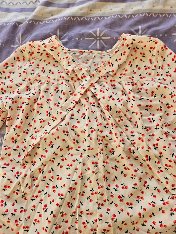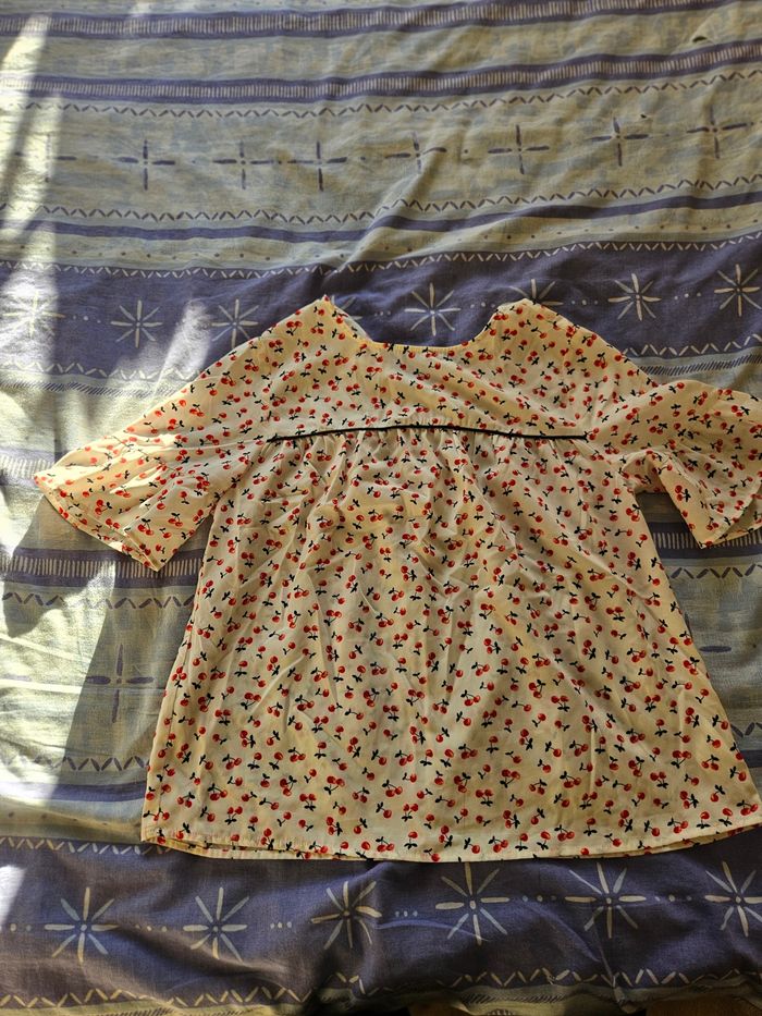Blouse tex, fermeture par noeud dans le dos. Détail noir sur le devant