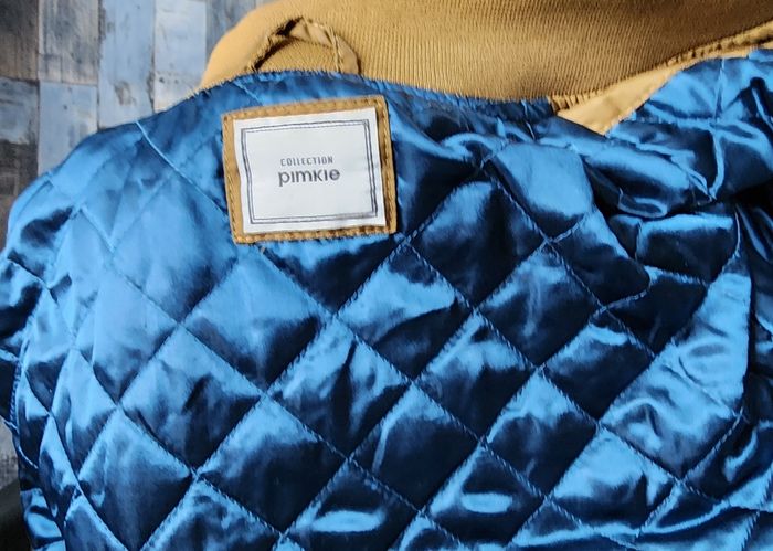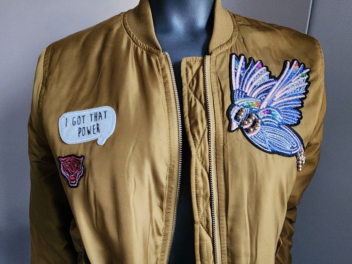 Il est moutarde doré, doublure intérieur bleue, taille 38. Marque Pimkie. Oiseau en broderie et perles. Il est en excellent état. Ses dimensions : longueur totale 56 cm, largeur sous aisselles 51 cm, longueur des manches 64 cm.