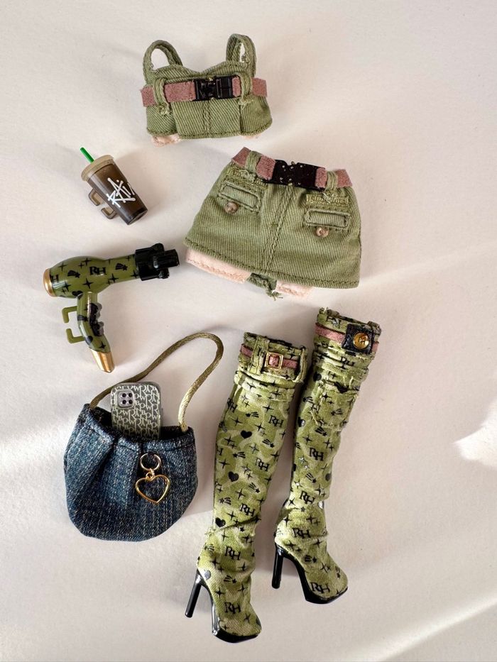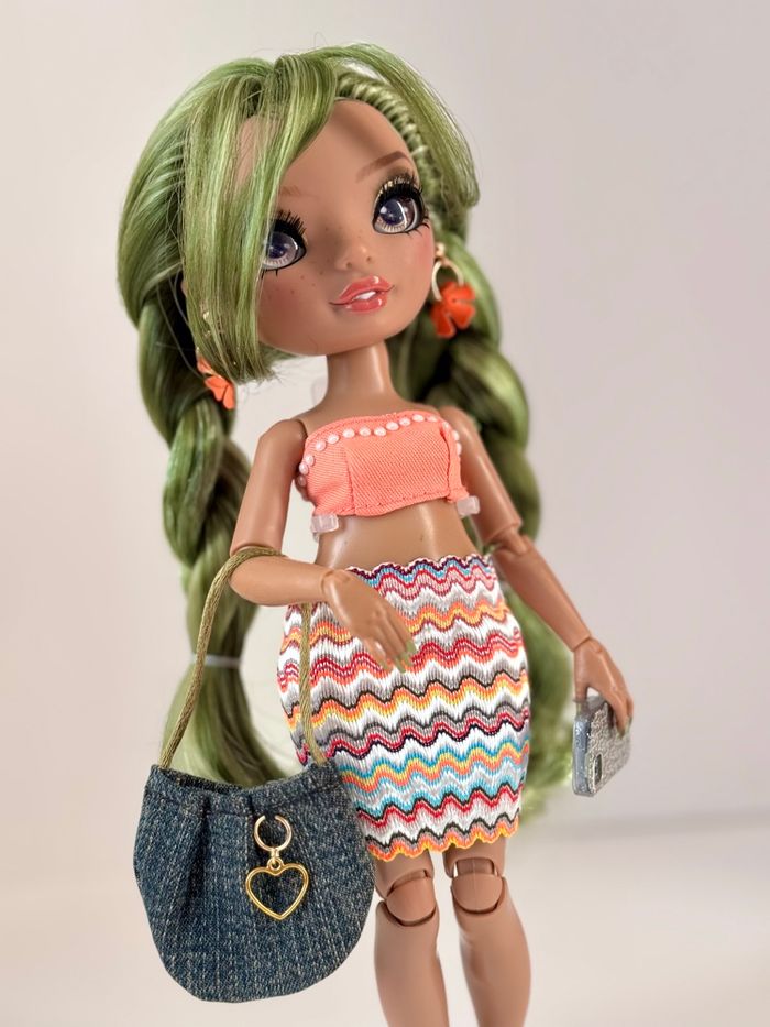 ⚠️ Le portant à vêtement n’est pas à vendre, il présente simplement la deuxième tenue. Occasion en très bon état. Une frange longue à été créée. Boucles d’oreilles, sac à main et jupe multicolore fabriqués à la main. Socle inclus. Maison non fumeur, envoi rapide et soigné