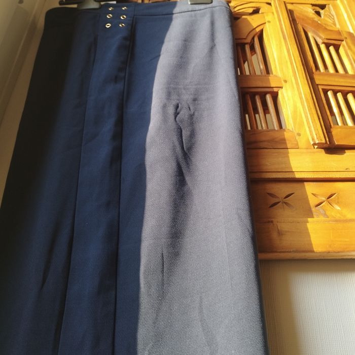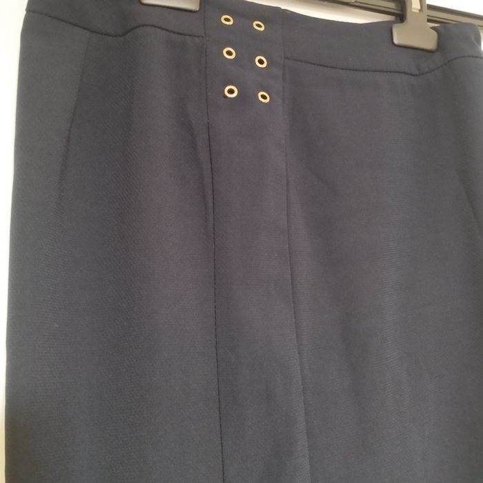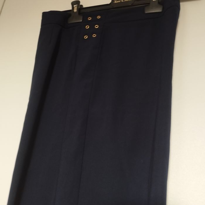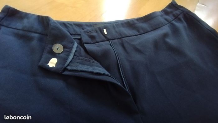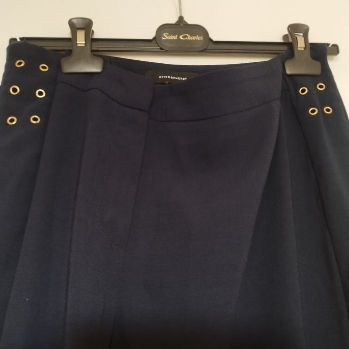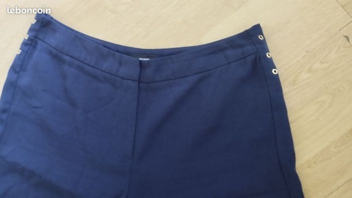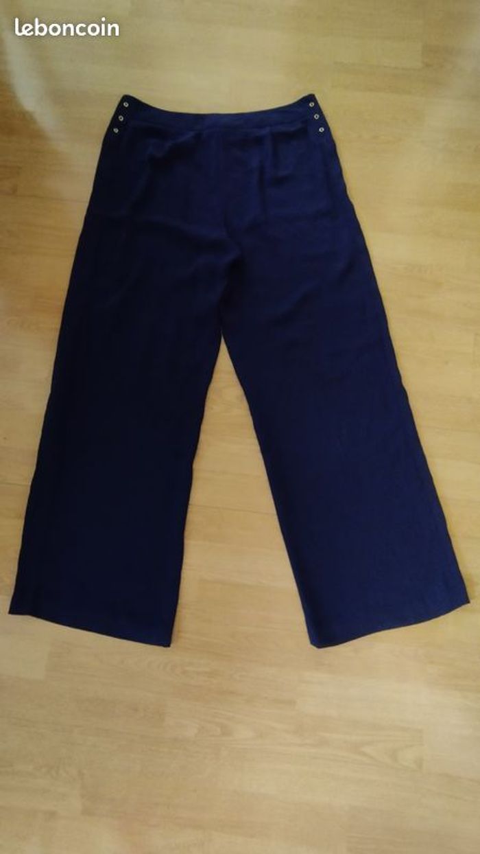 Pantalon large de chez Atmosphère. Bleu marine. Droit et large. Petits rivets dorés sur les 2 cotés du pantalon. Fermeture par fermeture éclair et petit crochet + 1 bouton à l'intérieur. Longueur 107cm et 29cm largeur bas de pantalon. Taille 44.