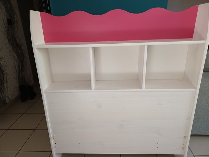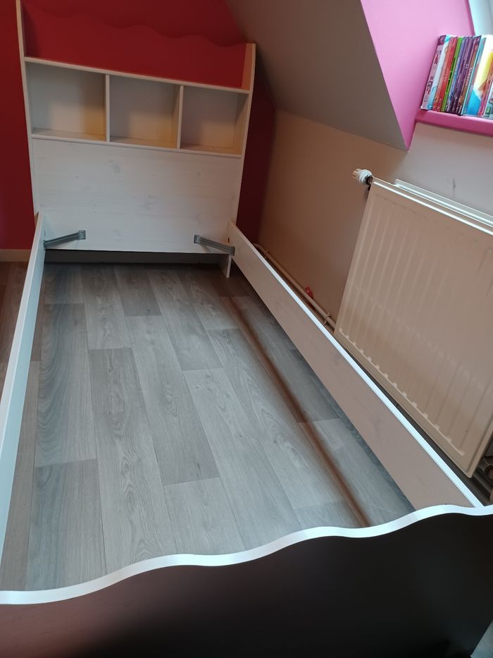 Chambre fille Lit avec tête de lit, niche intégrées Table de nuit Armoire avec un côté penderie avec une étagère Un côté avec 3 niches, 2 tiroirs et un miroir