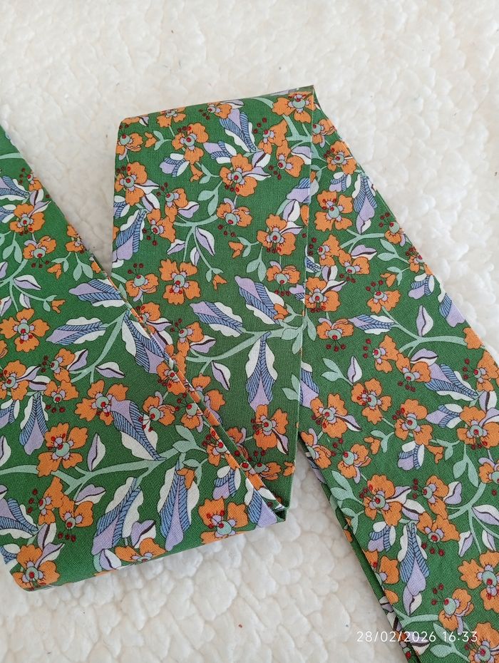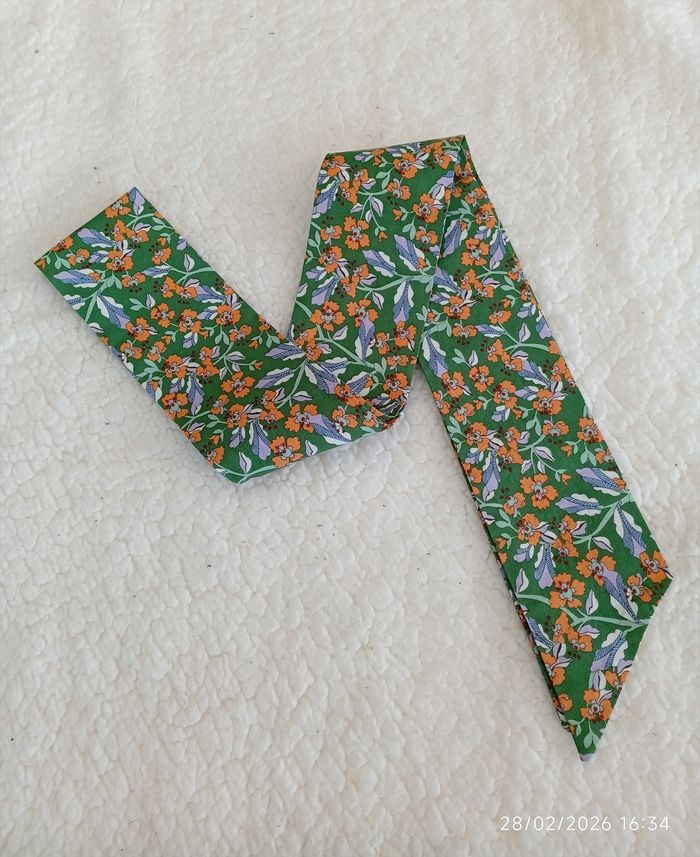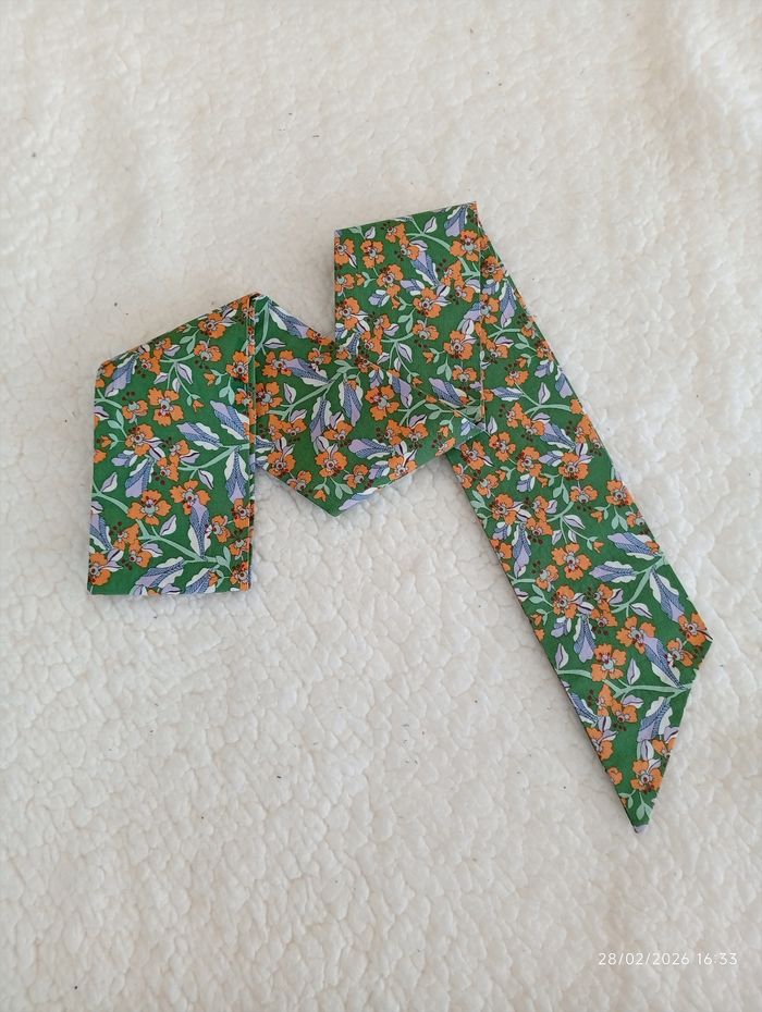 A porter autour du cou, sur un sac ou dans les cheveux. En coton /viscose, petites fleurs orange sur fond vert. 7cm/144cm