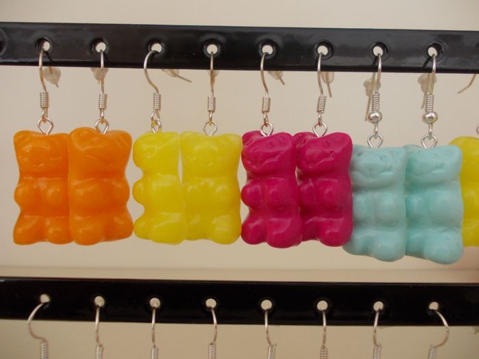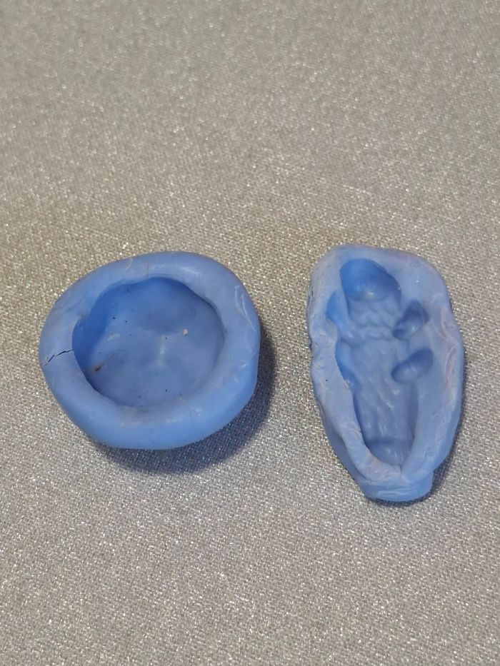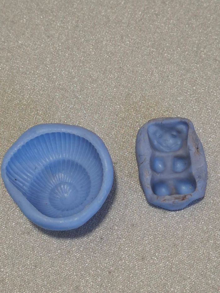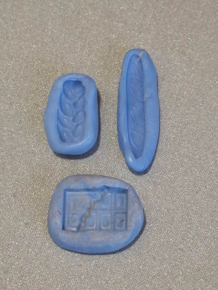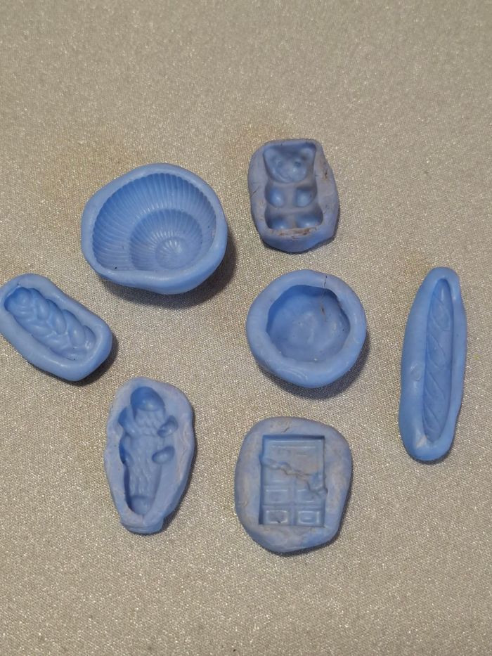 Joli lot de 7 moules en silicone pour créations gourmandes de baguette (4,3 x 0,6 cm), brioche (2,5 x 1 cm), rocher (diamètre 2 cm, profondeur 1 cm), plaquette chocolat (2,1 x 1,5 cm), escargot choco (3 x 2,7 cm), bonbon ourson (2,6 x 1,5 cm) et bonbon crocodile ( 3 x 1,5 cm) en pâte fimo, pâte à sel, argile, pâte à sucre, pâte d'amande, etc ... Idéal pour faire des boucles d'oreilles, colliers, porte-clés ou pour maison de poupées. Utilisés mais encore en très bon état. Nombreux détails réalistes.