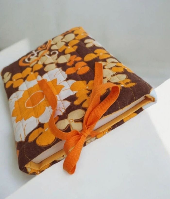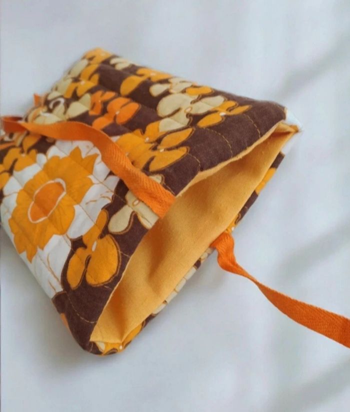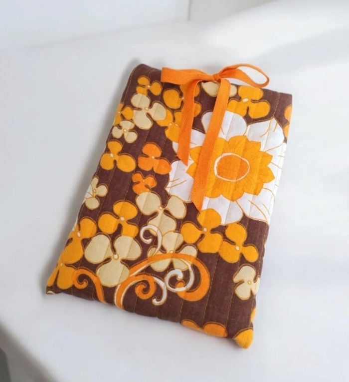 Pochette à livres ou tablette. Esprit vintage avec ses motifs fleuris et coloris vitaminés. Doublure lin jaune. Dimensions : Largeur:20cm Hauteur :25cm