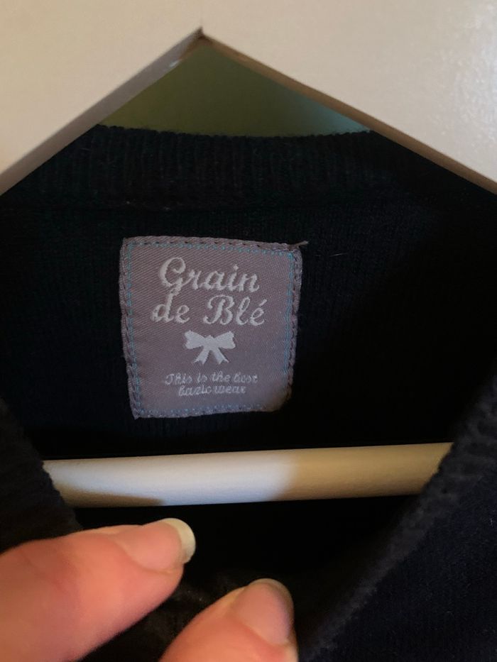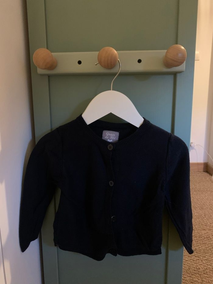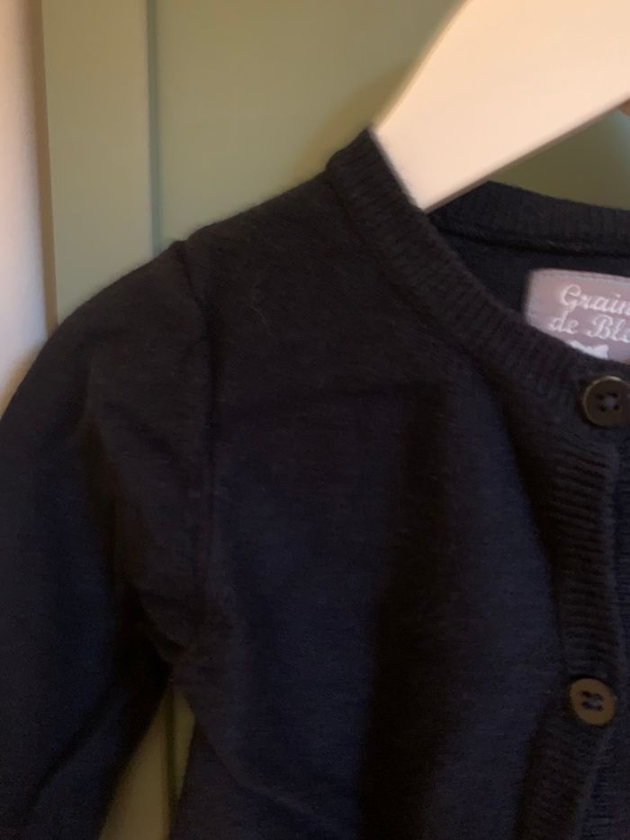 Gilet léger à manches longues couleur noir Marque: Grain de blé Taille: 12m Porte quelques fois, il est en très bon état général sans taches ni trous. 1 bouton à quelques traces d’usure