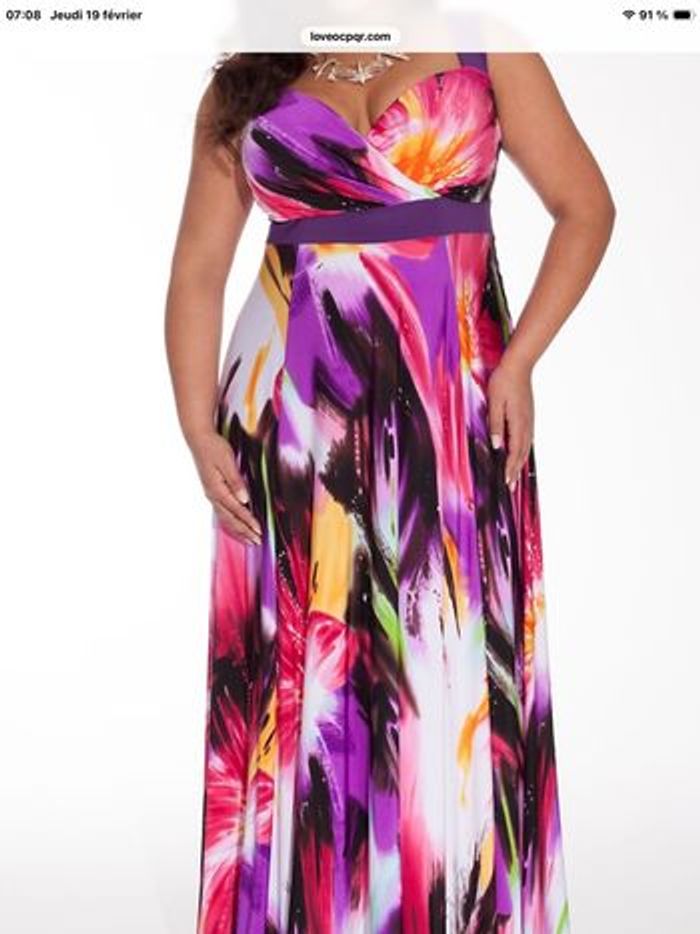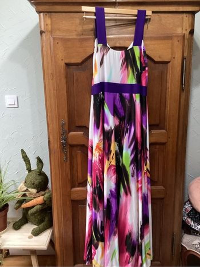 Jolie robe longue Tres jolie robe longue tissu lourd avec doublure Les couleurs sont très belles Jamais portée valeur 139€ Taille 48/50 (voir les mesures ) Poitrine 49cm, hanches 75 cm longueur 148cm